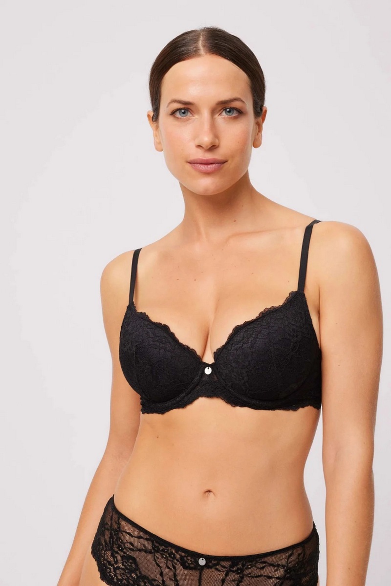 Бюстгальтер с чашкой из тонкого поролона на кости. Выполнен из цветочного кружева. Несъемные регулируемые бретели. Декор - подвеска. Европейский размер соответствует российскому размеру!