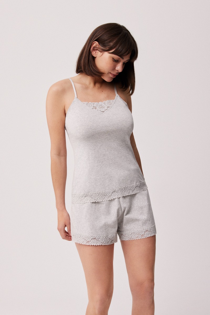Женская пижама с шортами из фэшн коллекции 2023 от европейского производителя Ysabel Mora. Хлопковая мягкая пижама с добавлением кружева. Несъемные бретели, регулируемые по длине. Шортики на удобной резинке.