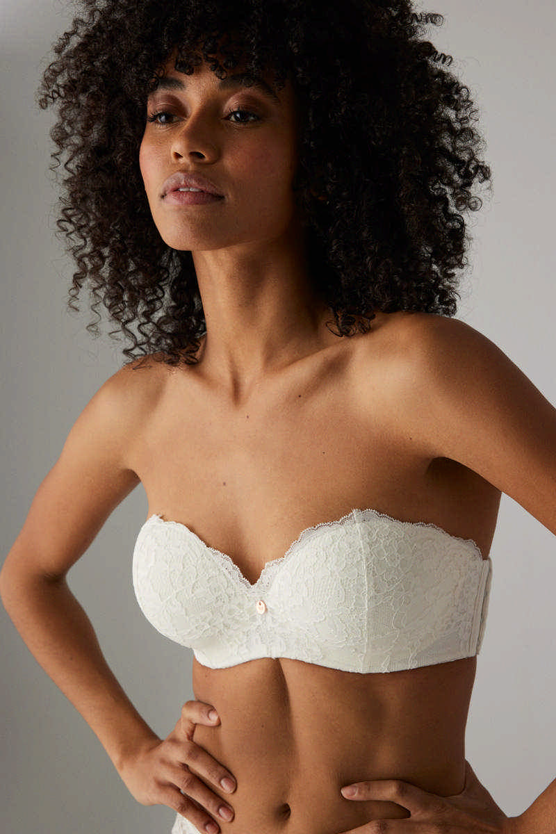 Кружевной бюстгальтер от европейского производителя Ysabel Mora. Чашка на тонком поролоне. Стан с вертикальной костью. Его съемные бретельки позволяют использовать несколько положений, адаптируясь к разным стилям. Бюстгальтер с боковой застежкой, он идеально подходит для одежды с открытой спиной, становясь идеальным выбором для невесты в ее свадебном образе.