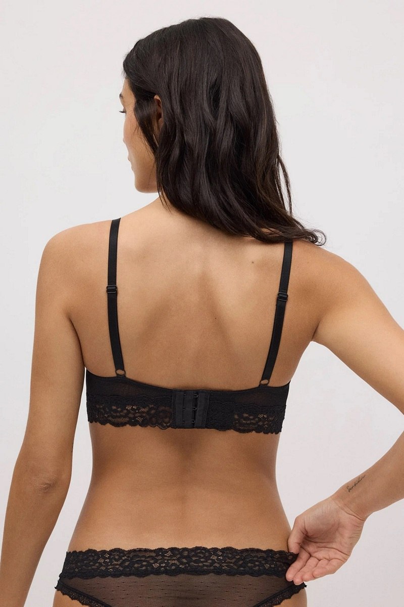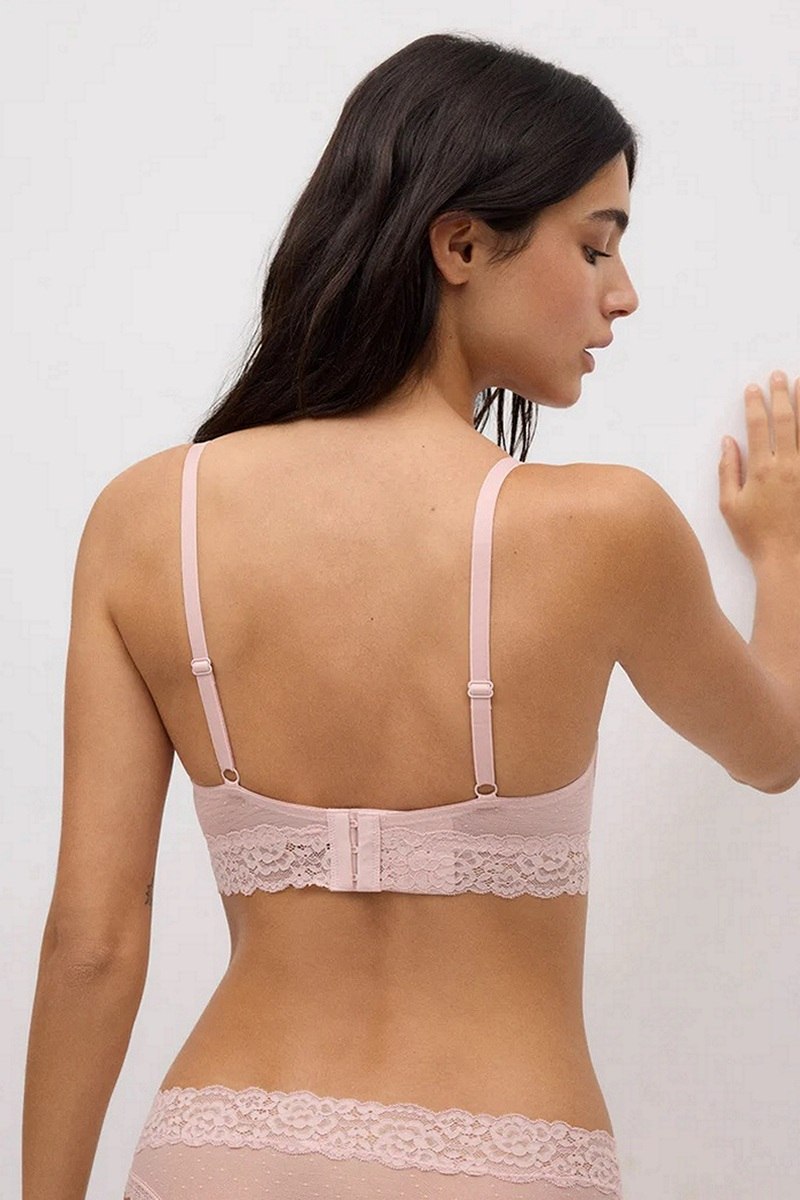 Бюстгальтер бралетт с чашкой на тонком поролоне без косточек. Выполнен из плюмети и кружева. Несъемные регулируемые бретели. Сочетайте его с трусиками из коллекции и завершите образ нижнего белья.