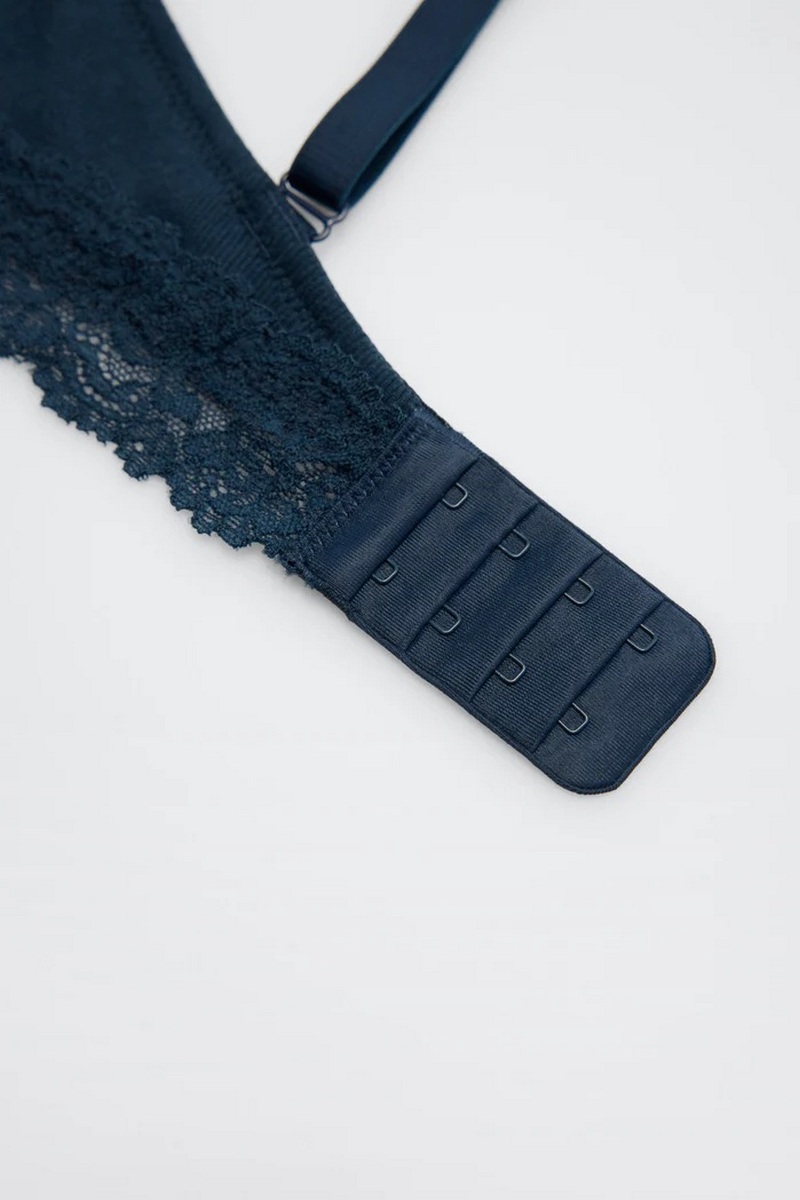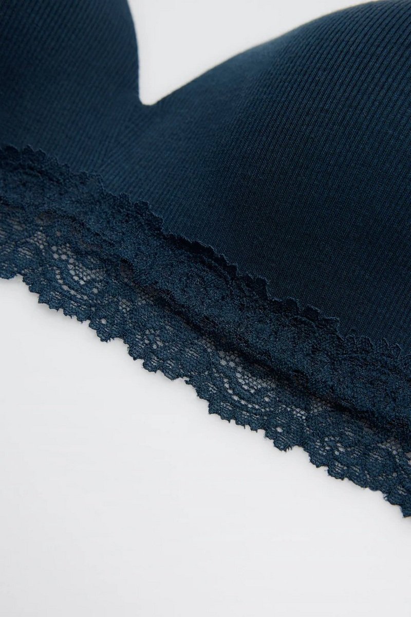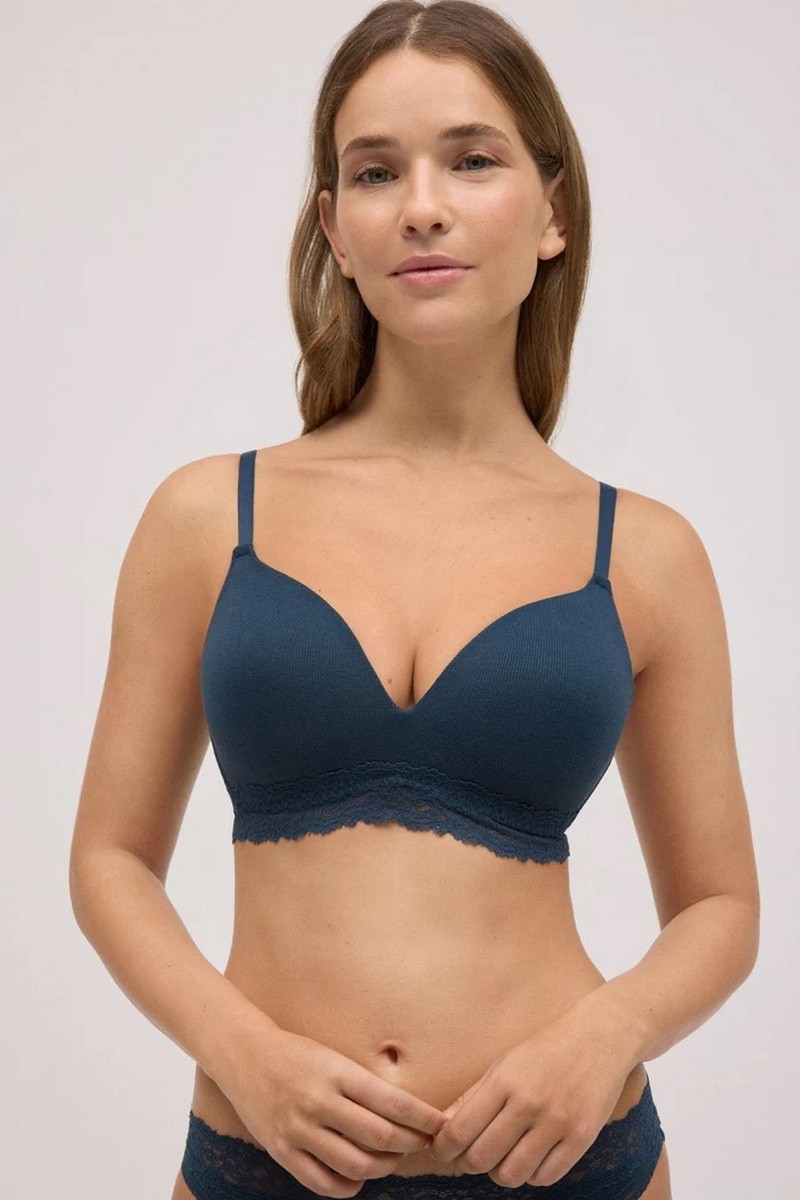 Белье из фешн коллекции от европейского производителя Ysabel Mora. Чашка без кости из дышащего поролона, держит форму и отлично прилегает к груди. Ткань в рубчик дополнена нежным кружевом. Бретели несъемные, регулируются по длине.