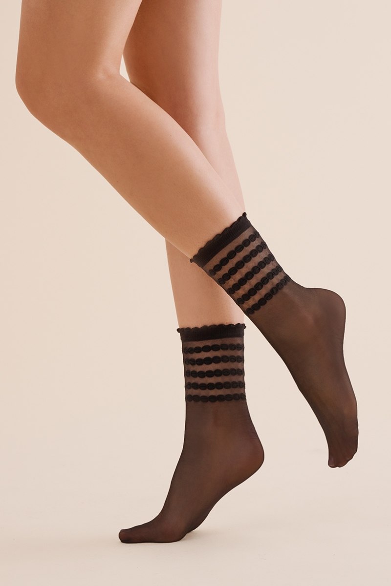 Женские носки Lora 20 DEN идеально соответствуют форме стопы. Отсутствие отмеченной пятки и носка позволяет сочетать тонкие носки с разной обувью. Невидимое усиление на носках делает носки более прочными и устойчивыми к затяжкам. Эластичная резинка не давит на ноги и позволяет удерживать носки с рисунком на нужном месте.