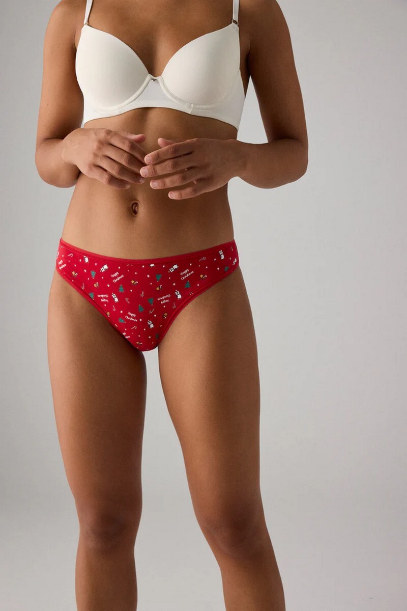 Рождественская коллекция. Мини-трусики с праздничным принтом. Этот очаровательный дизайн украшен рождественскими мотивами, которые добавят нотку игривости вашей коллекции нижнего белья во время праздников. Эти трусики, изготовленные из мягких и удобных материалов, обеспечивают идеальную посадку и приятные ощущения на коже. Будь то для повседневного использования или в качестве забавного сюрприза во время торжеств, эти рождественские трусики заставят вас почувствовать себя празднично и элегантно.