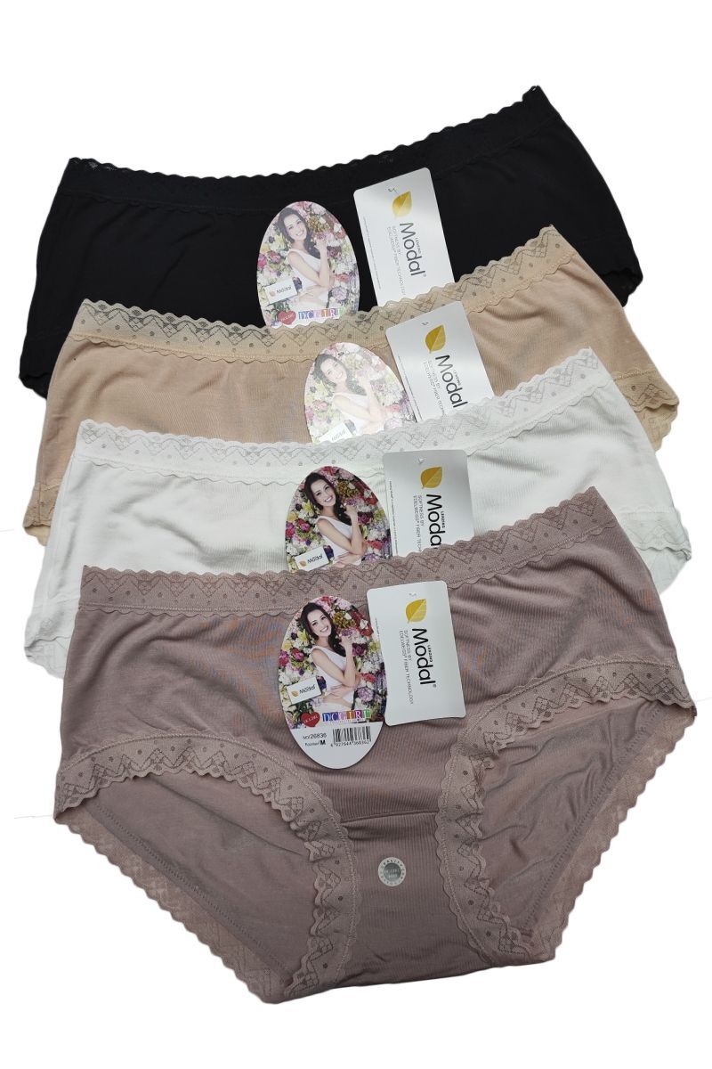 Женские трусики, изготовлены из мягкого модала. Дополнены кружевом. Средняя посадка. В упаковке 12 штук. Размеры в упаковке (M:L:XL=4:4:4), различные цвета.