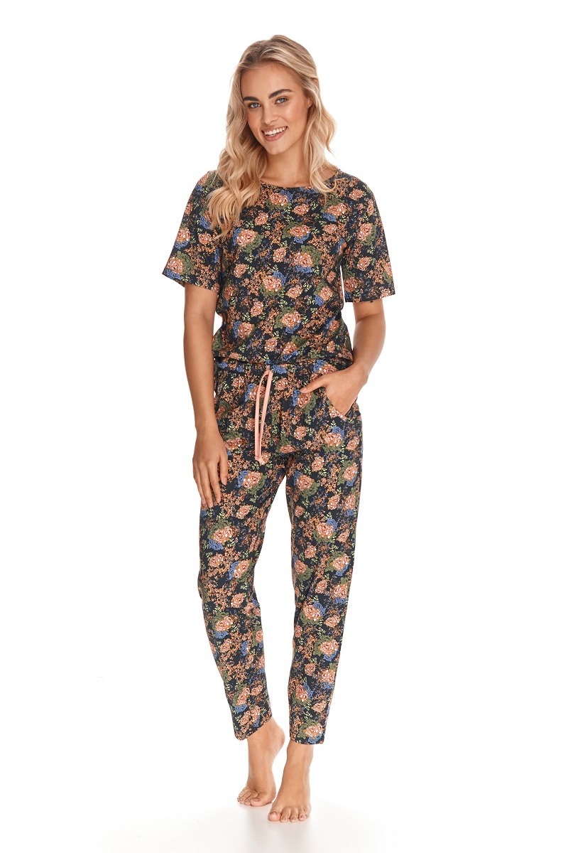 Яркая и уютная пижама в двух расцветках. Удобные брюки с карманами на шнуровке комплектуются футболкой. Сочный цветочный принт придаст вам яркости и добавит нотку женственности.