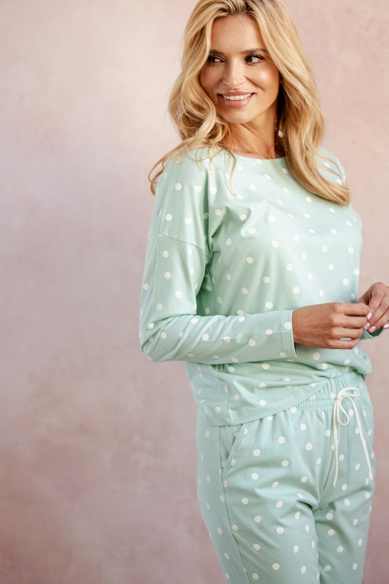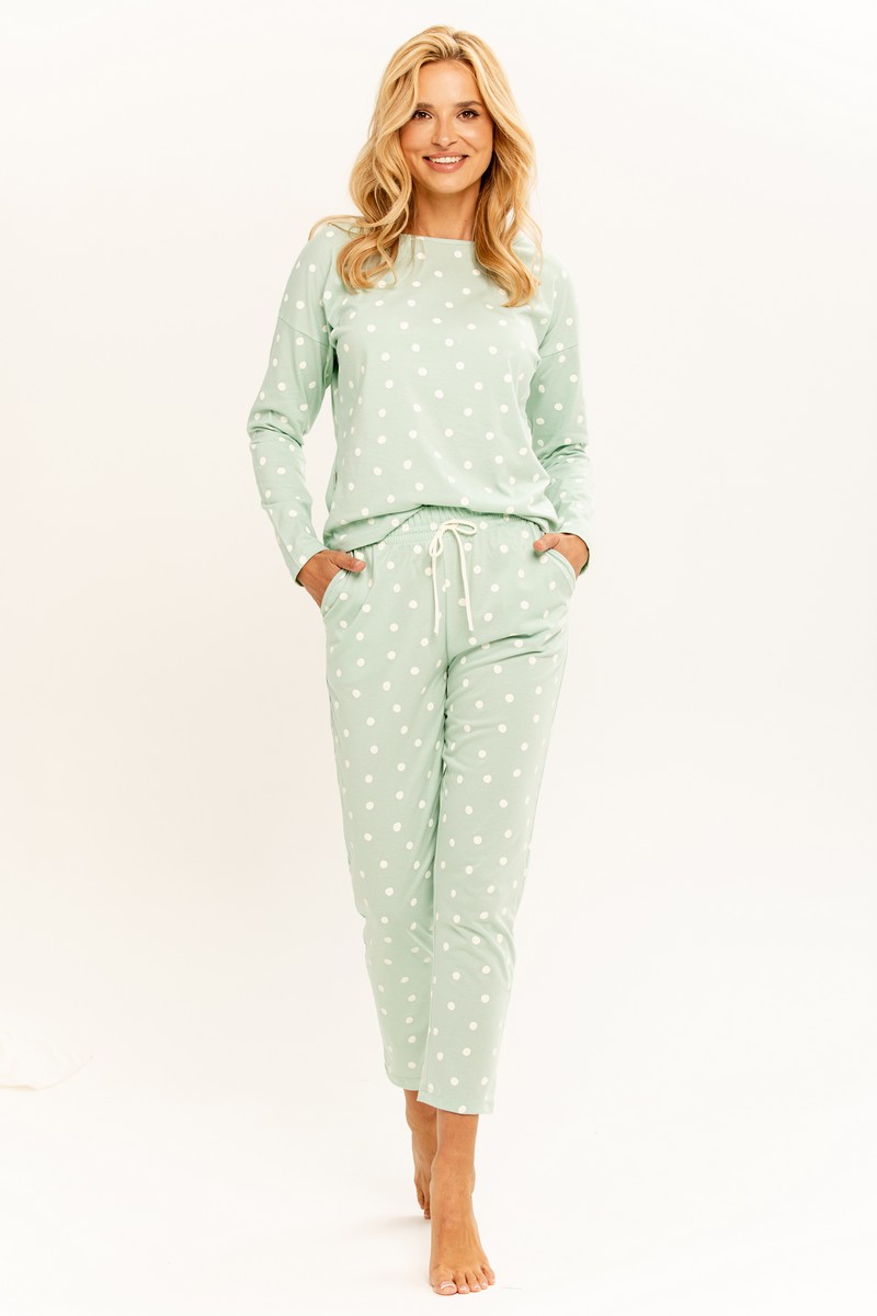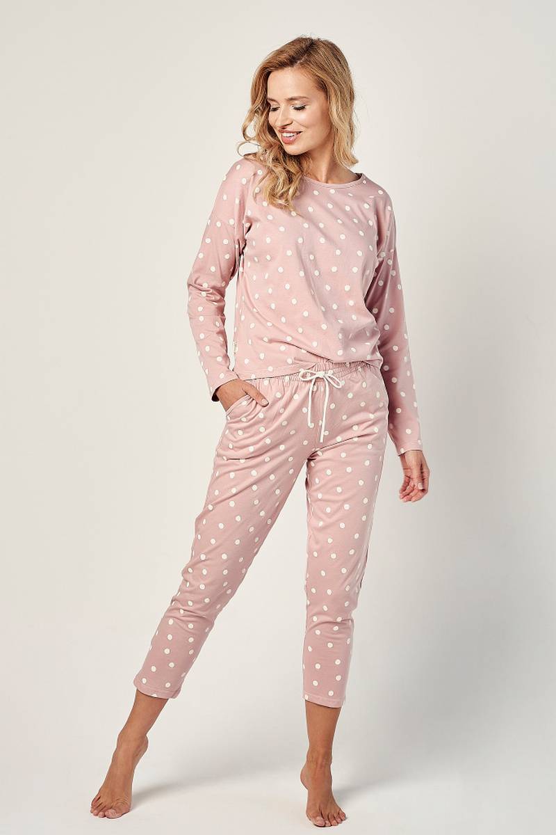 Женская хлопковая пижама со штанами CHLOE от европейского производителя Taro. В комплекте узорные кофта и штаны. Брюки длиной 7/8, с карманами.