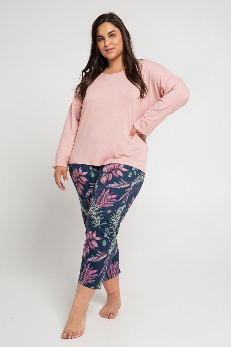 Женская пижама со штанами VIVIAN от европейского производителя Taro. В комплекте вискозная кофта с рукавом 3/4 и узорные штаны длиной 7/8. В увеличенных размерах штаны длинные.