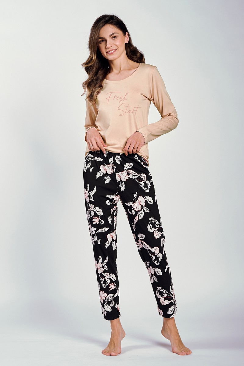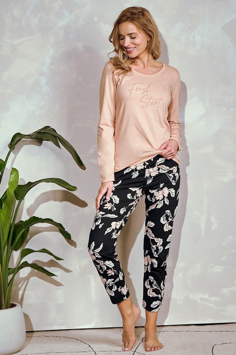 Женская хлопковая пижама со штанами KATIE от европейского производителя Taro. В комплекте однотонные кофта с нагрудным принтом и узорные брюки 7/8.