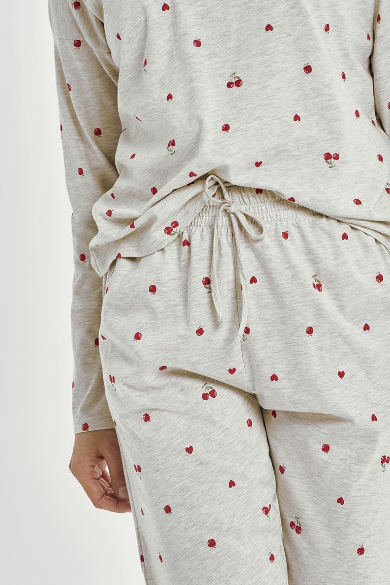 Женская пижама из натурального хлопка с вишневым принтом. Состоит из футболки с длинным рукавом и круглым вырезом, а также длинных брюк с удобным шнурком на талии и вместительными карманами на бедрах.