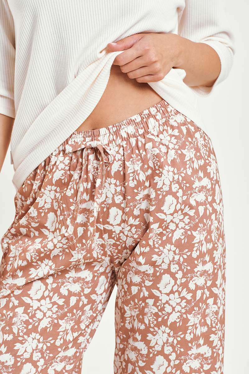 Пижама женская со штанами. Верх свободного кроя в полоску, рукав 3/4, круглый вырез горловины. Хлопковые укороченные брюки, украшенные цветочным принтом, пояс со шнурком.