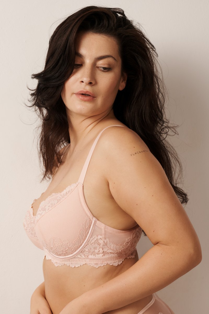 Кружевной бюстгальтер с полупоролоновой чашкой на кости и съемными вкладышами пуш-ап. Регулируемые бретели. Трехступенчатая застежка на крючки.