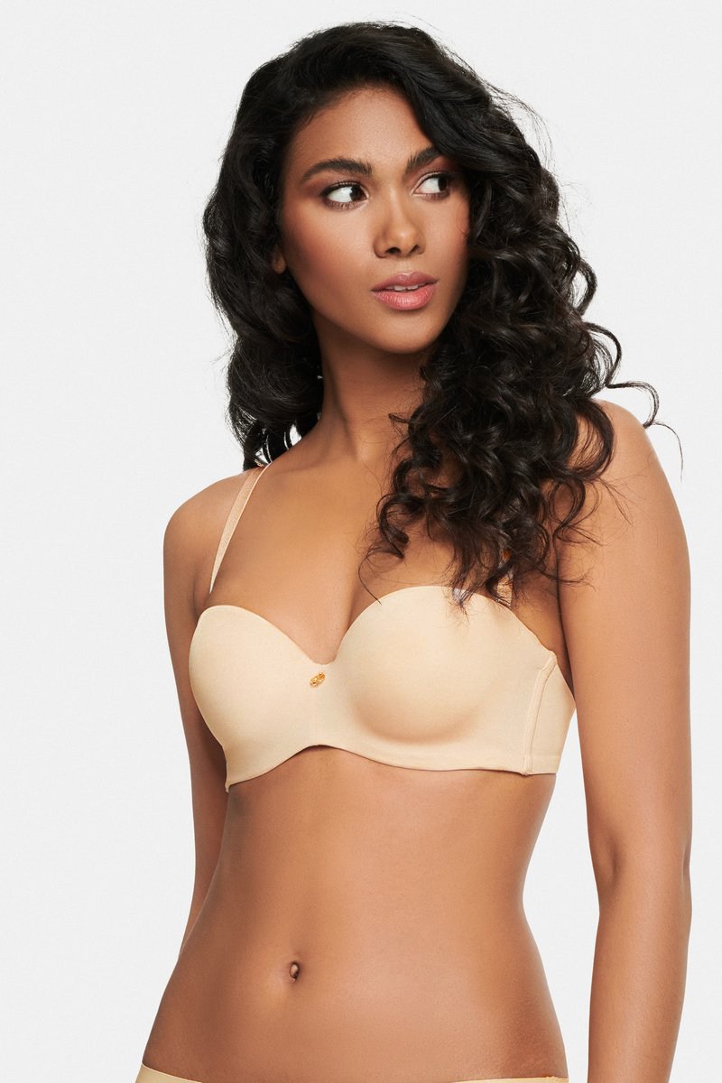 Гладкий бюстгальтер 39719 RAFFEN от европейского производителя Esotiq. Чашка на кости, со съемными вкладышами push up на хлопковом подкладе. Спинка выполнена из гладкой микрофибры с сечтатым подкладом. Продублирована силиконовой лентой внутри для лучшей фиксации без бретелей. Отстегивающиеся, регулируемые по длине бретели.