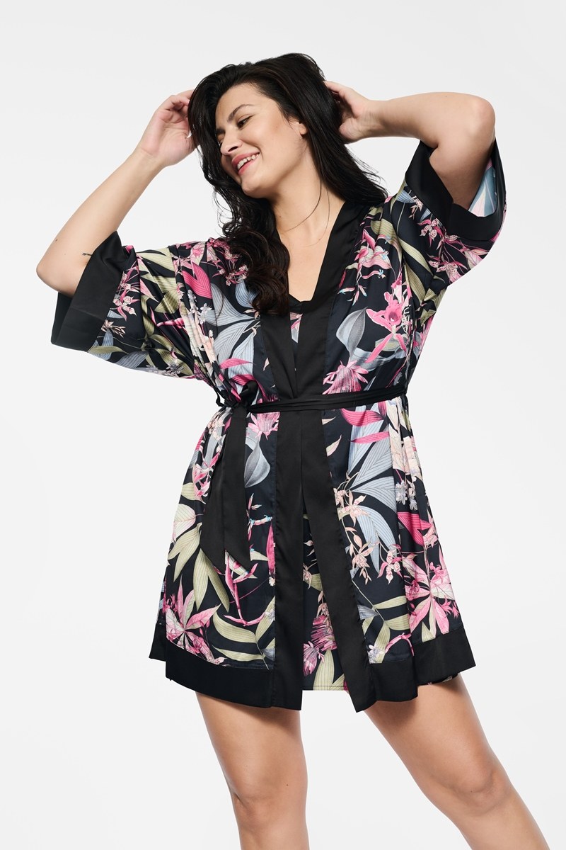 Нежный атластный халат кимоно. Изделие с поясом, на запахе. Укороченный широкий рукав.