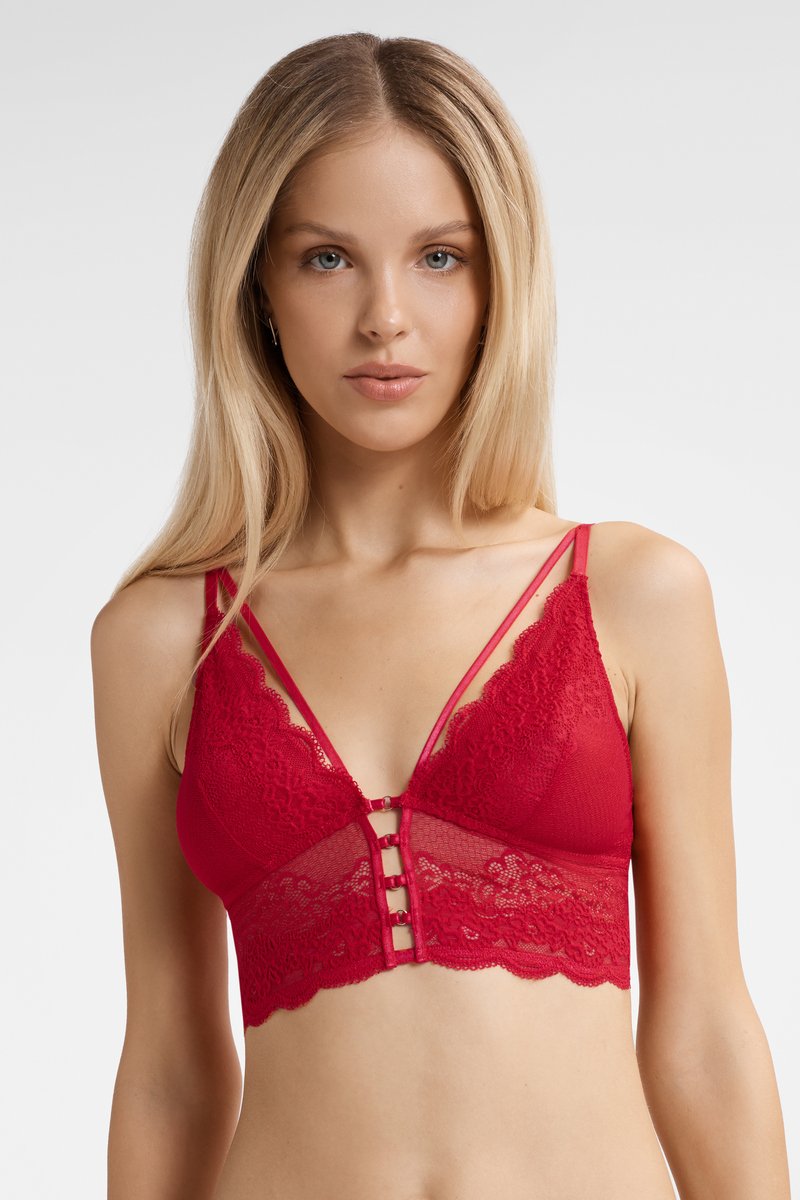 Кружевной бралетт с мягкой чашкой без кости. Трехступенчатая застежка. Несъемные регулируемые бретели.