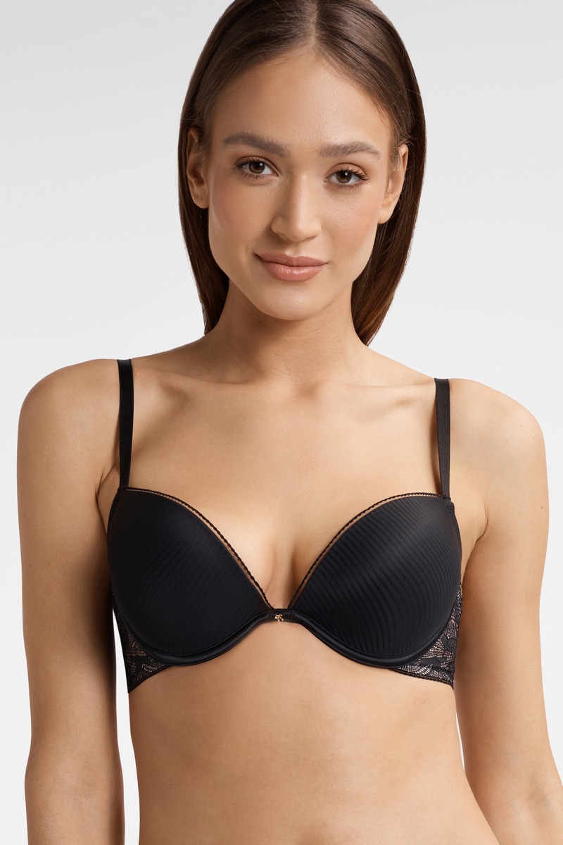 Бюстгальтер KYOKO от европейского производителя Esotiq. Бюстгальтер с чашкой пуш-ап на кости. Выполнен из микротюля и дополнен кружевом. Трехступенчатая застежка на спине. Несъемные регулируемые бретели.