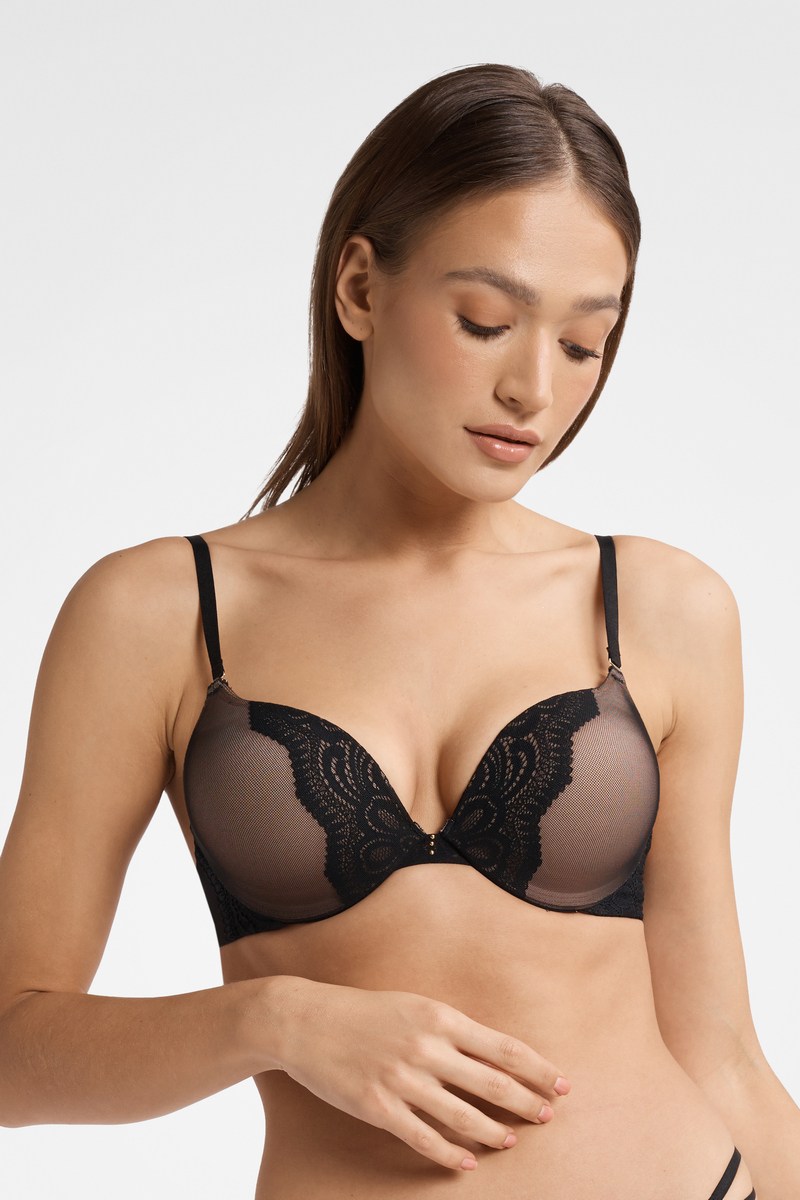 Бюстгальтер KENDRA от европейского производителя Esotiq. Бюстгальтер с чашкой супер пуш-ап на кости. Выполнен из микротюли и дополнен кружевом. Трехступенчатая застежка на спине. Съемные регулируемые бретели.