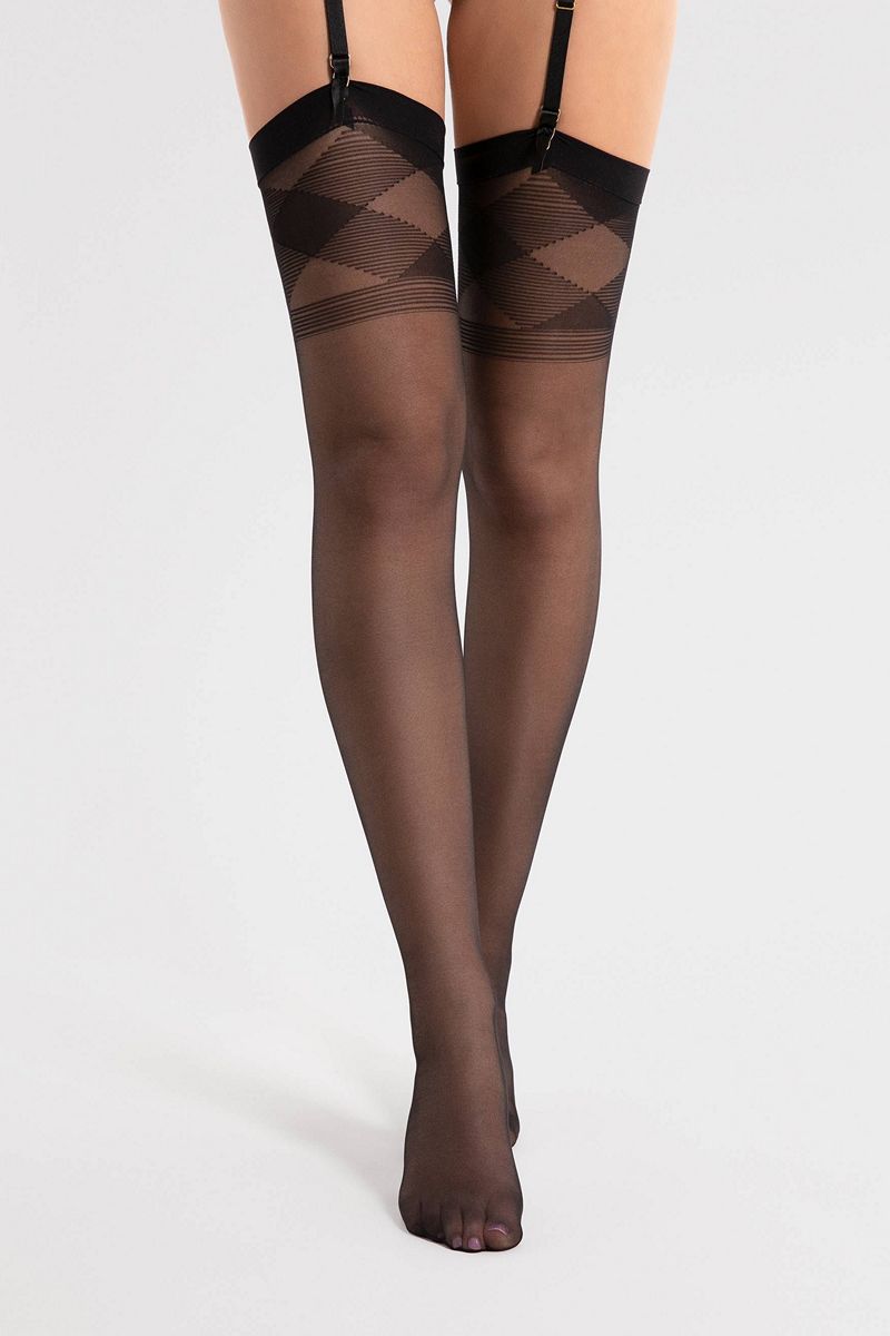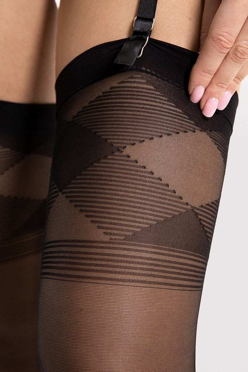 Чулки с узорчатым верхом. Геометрические структуры переплетаются и привлекают чувства. Для любителей минимализма и простых форм. Они подойдут как для особых случаев, так и для повседневной жизни благодаря гладкой основе и классическому черному цвету.