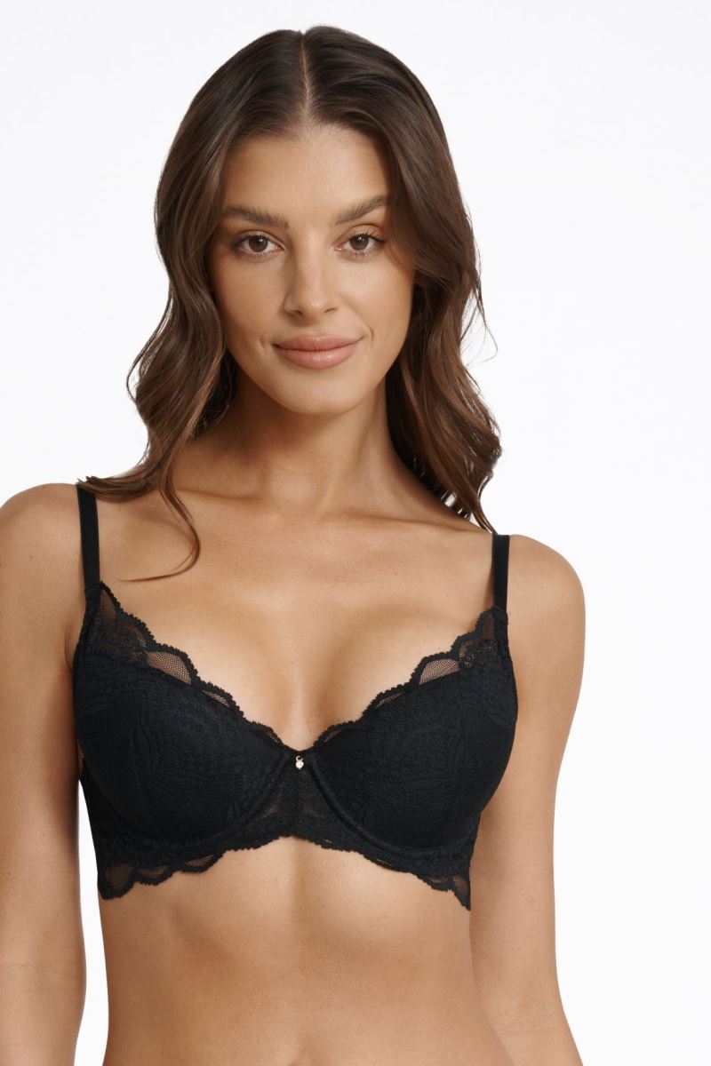 Кружевной бюстгальтер SONG. Чашка на кости со съемным пуш-ап. Внутренняя поверхность чашек хлопковая. Несъемные ругулируемые бретели. Кружево: 85% полиамид,15% эластан Сетка: 90% полиамид, 10% эластан Подклад чашки: 100% хлопок