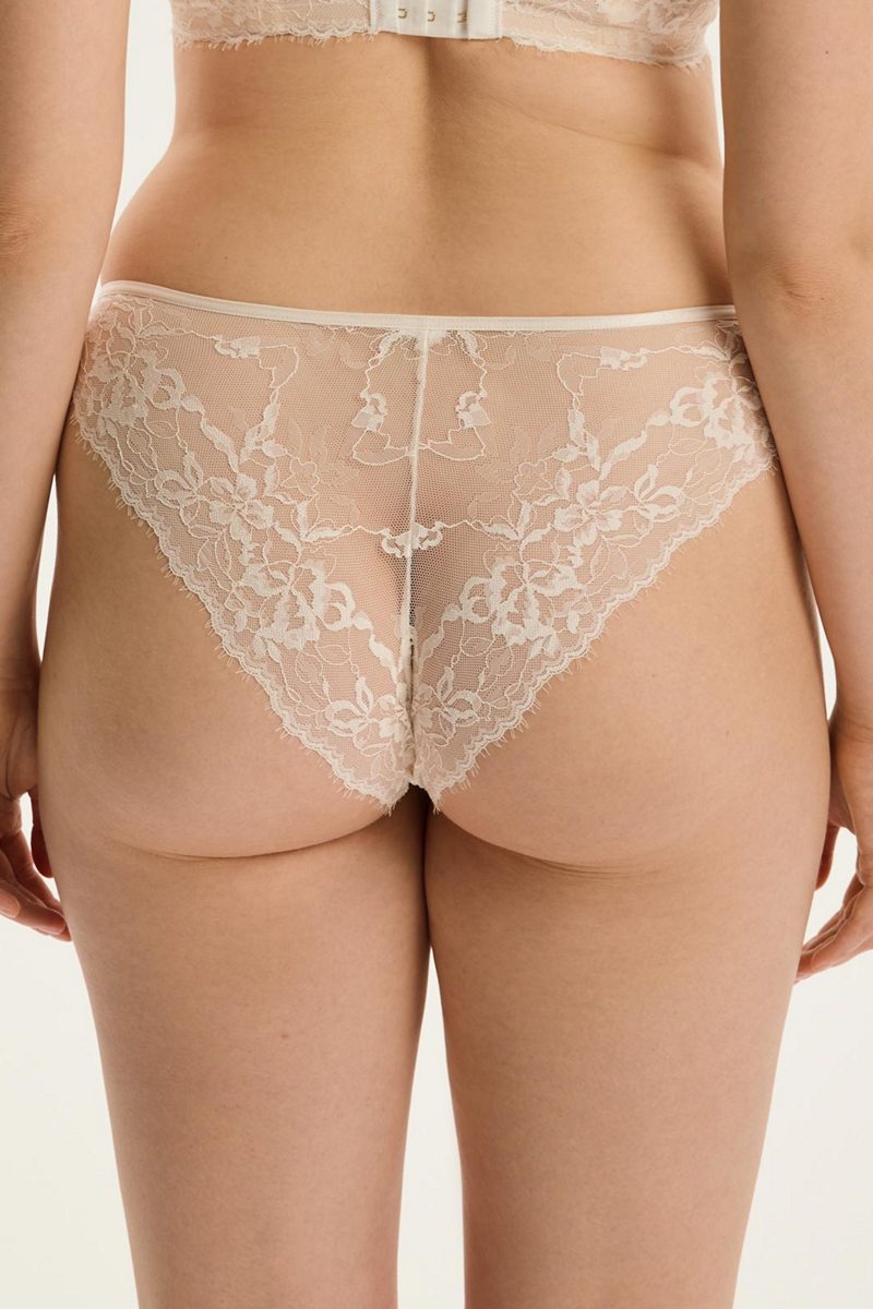 Трусы слипы Cloe обволакивают силуэт замысловатым кружевом, который рисует на коже нежный растительный орнамент. Тонкий волнистый край мягко ведет линию бедер, а передняя часть складывается в букву "V", красиво подчеркивая пропорции. Светящийся кремовый оттенок подчеркивает легкость и неземной характер модели.