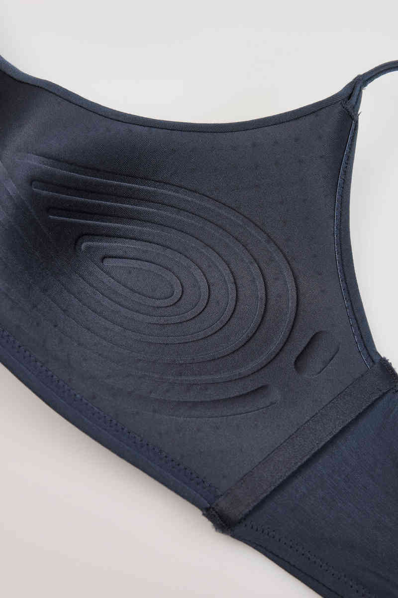 Топ Comfie в темно-синем оттенке - это модель, в которой современные технологии сочетаются с утончённой элегантностью. Бесшовная конструкция и отсутствие косточек обеспечивают естественное прилегание к фигуре, а инновационные выступы в чашечках поддерживают грудь и обеспечивают правильную циркуляцию воздуха. Изготовленный из дышащего, приятного на ощупь материала с волокном TENCEL™, он гарантирует комфорт в течение всего дня - от активных занятий до отдыха. Минималистичный дизайн делает эту модель идеальной для женщин, которые ценят простоту и удобство в роскошном исполнении. Нежный подклад чашки из 100% полиэстера. Несъемные регулируемые бретели.