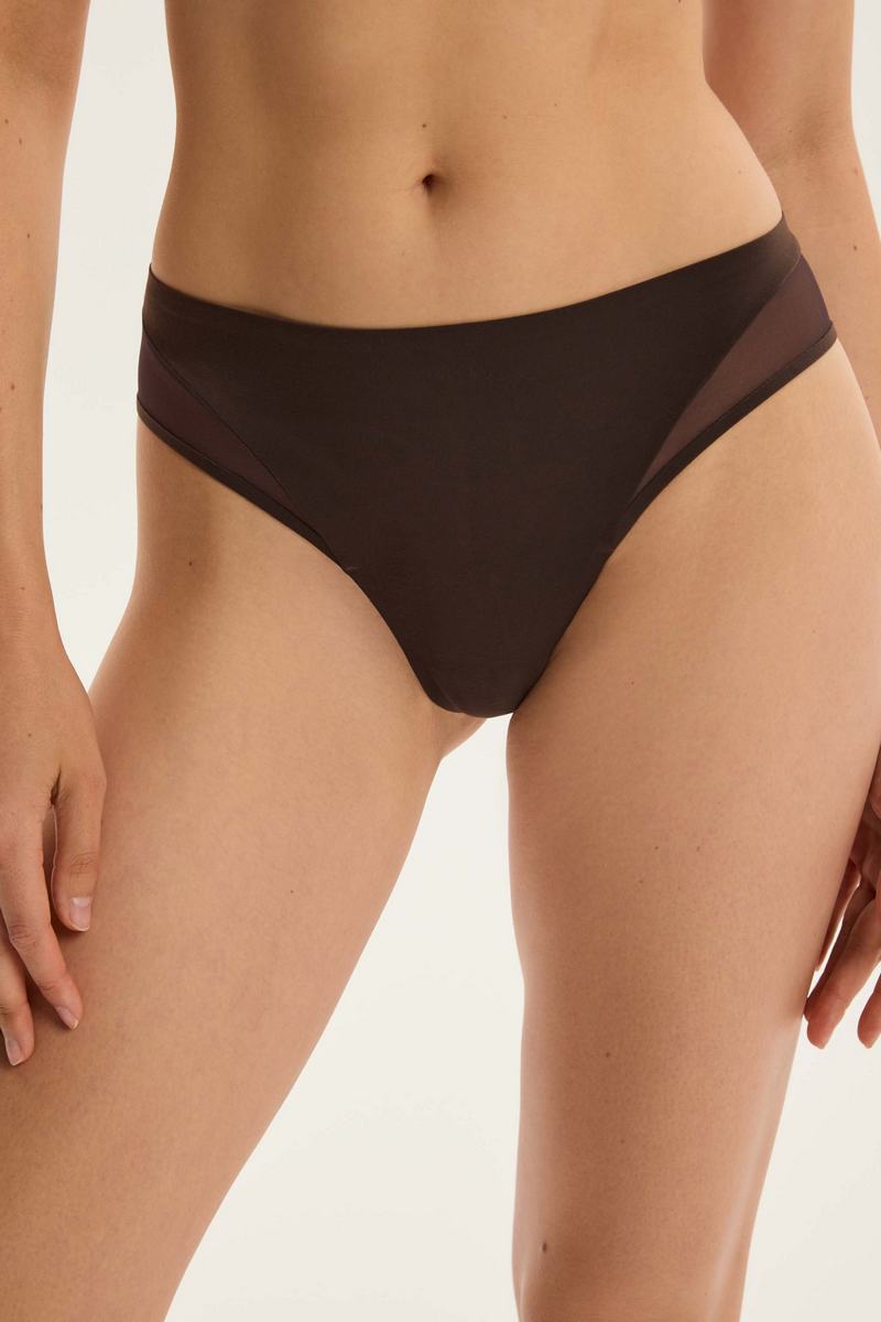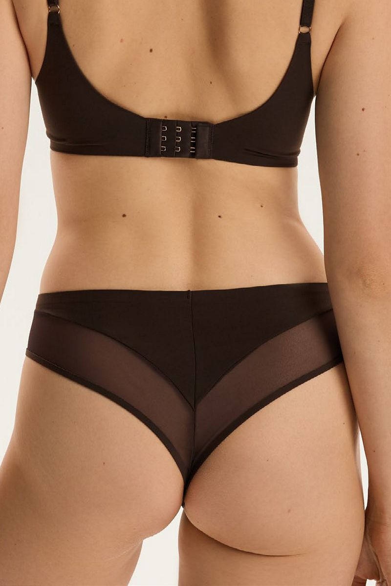 Тонкая чувственность в глубоком шоколадно-коричневом цвете. Бразильяно Cleary сочетают в себе гладкую переднюю часть и мягкую прозрачную сетку сзади, создавая изысканный комплект, который подчеркивает линию бедер и ягодиц. Изящно вырезанные бока визуально удлиняют ноги, а эластичная талия обеспечивает идеальную посадку без сдавливания. Нижнее белье разработано таким образом, чтобы оставаться незаметным даже под самой облегающей одеждой. Хлопковая ластовица. Сеточка: 84% полиамид, 16% эластан.