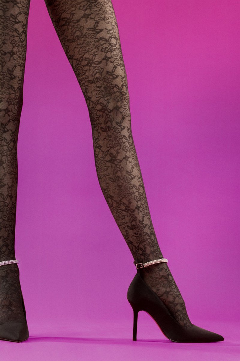 Колготки 30 den с цветочным узором, который распространяется по всей длине ног, а также в части трусиков, поэтому мы избегаем резкого отрезания мотива и удлиняем ваши ноги до максимума!
