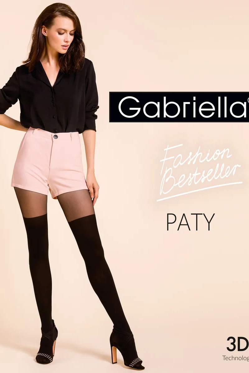 Колготки, имитирующие чулки, Paty - удобное решение для женщин, которые любят высокие чулки. Гладкие черные колготки встречаются в середине бедра с тонким прозрачным трикотажем, который придает образу женственный шарм. Украшает ноги трикотаж в двух толщинах, сочетающий в себе достоинства колготок 60 den и колготок 20 den в середине бедра. Хлопковый клин с плоским швом повышают комфорт использования. Невидимое усиление на пальцах ног позволяет черным колготкам сочетаться с любой обувью. Структура модных колготок делает изделие более прочным и устойчивым к затяжкам.