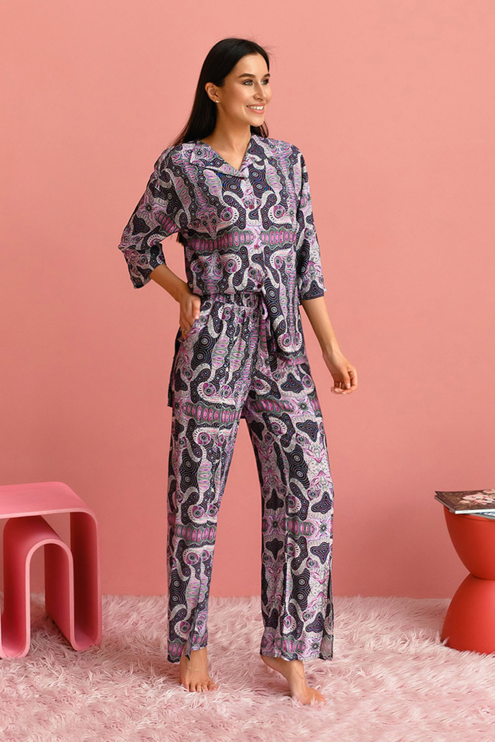 Комплект из туники и брюк, выполнен из принтованной вискозы. Туника свободного силуэта. Полочка укороченная, с застежкой планкой на пуговицах и отложным воротником. Спинка удлиненная, горловина на спинке обработана обтачкой. Разрезы в боковых швах. Рукав 7/8 с разрезом по верхнему шву. Брюки с карманами, свободного силуэта с разрезами по передней детали. Пояс на завязке-кулиске и эластичной ленте.