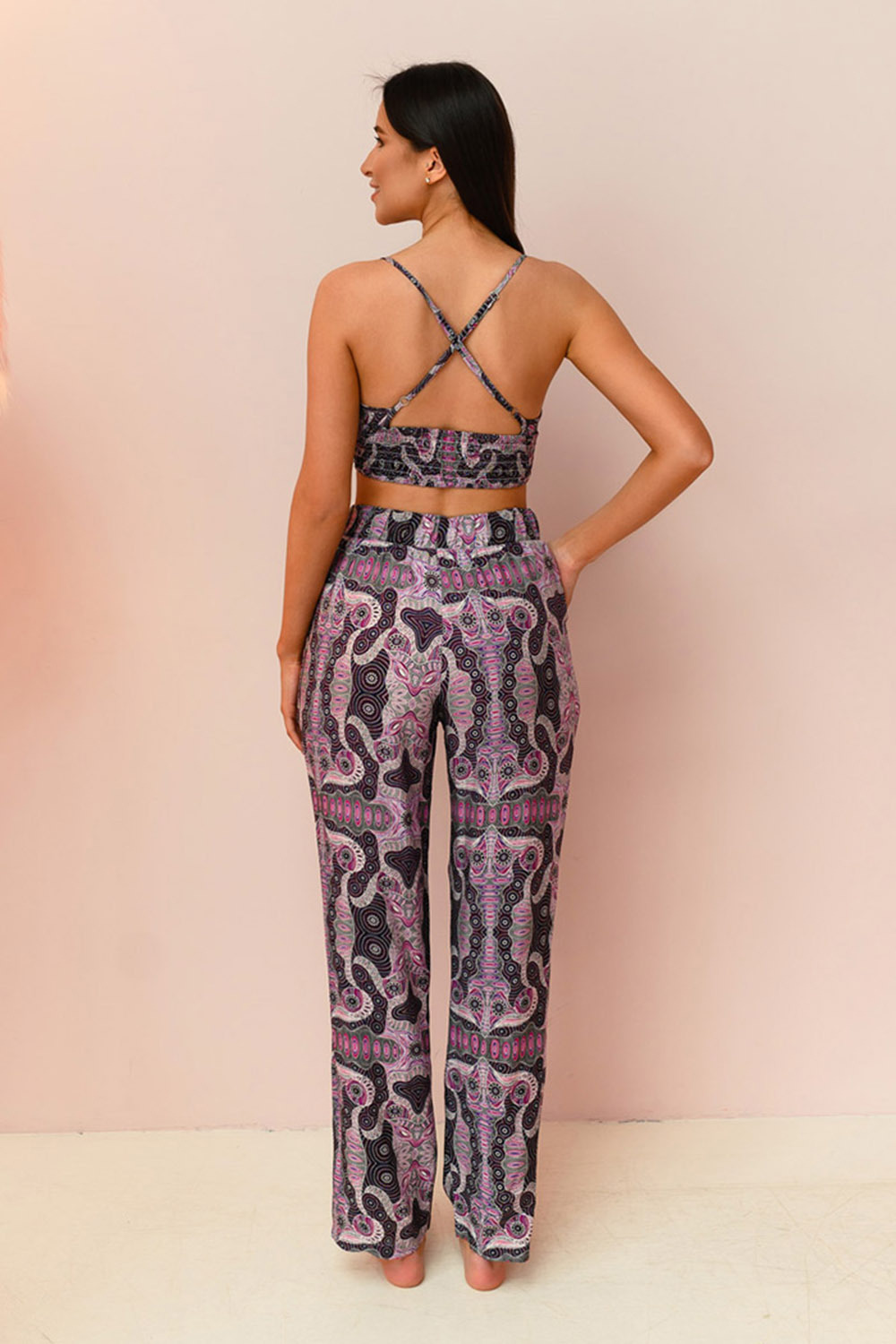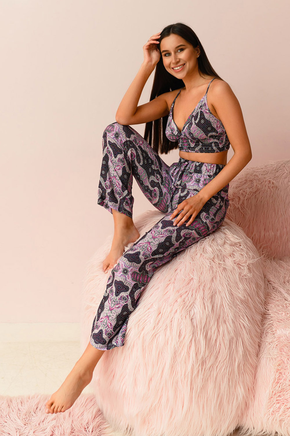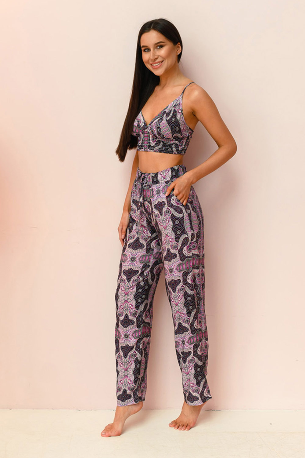 Комплект из топа и брюк, из принтованной вискозы. Легкий укороченный топ треугольник, на широкой резинке под грудью. Глубокий V-образный вырез. Регулировка бретелями из основного полотна. Брюки с карманами, свободного силуэта. Пояс на завязке-кулиске и эластичной ленте