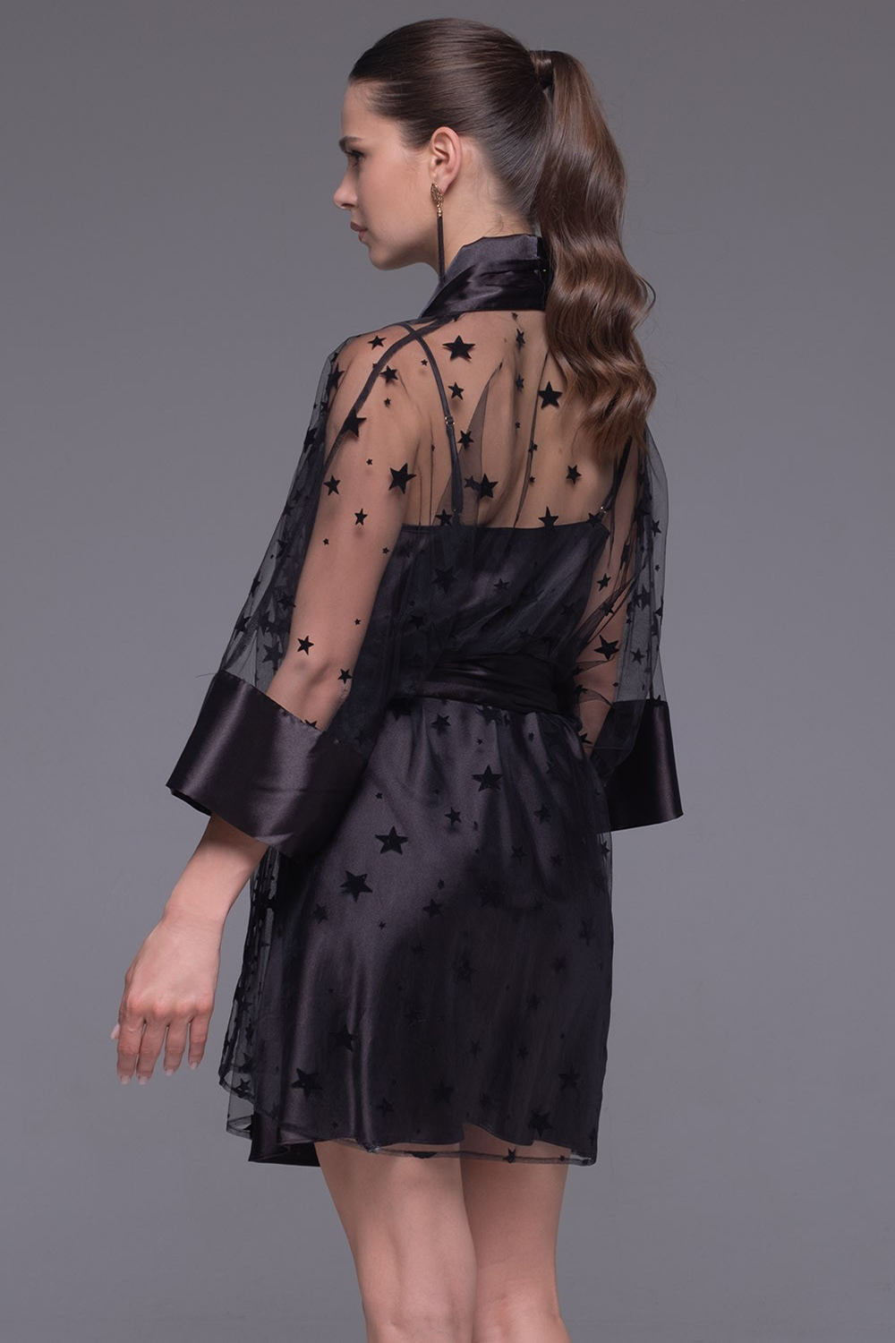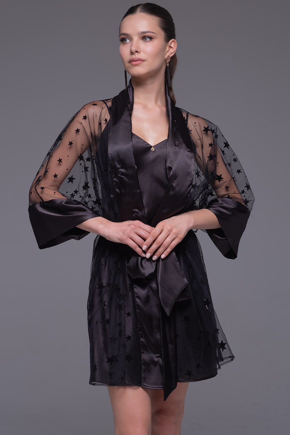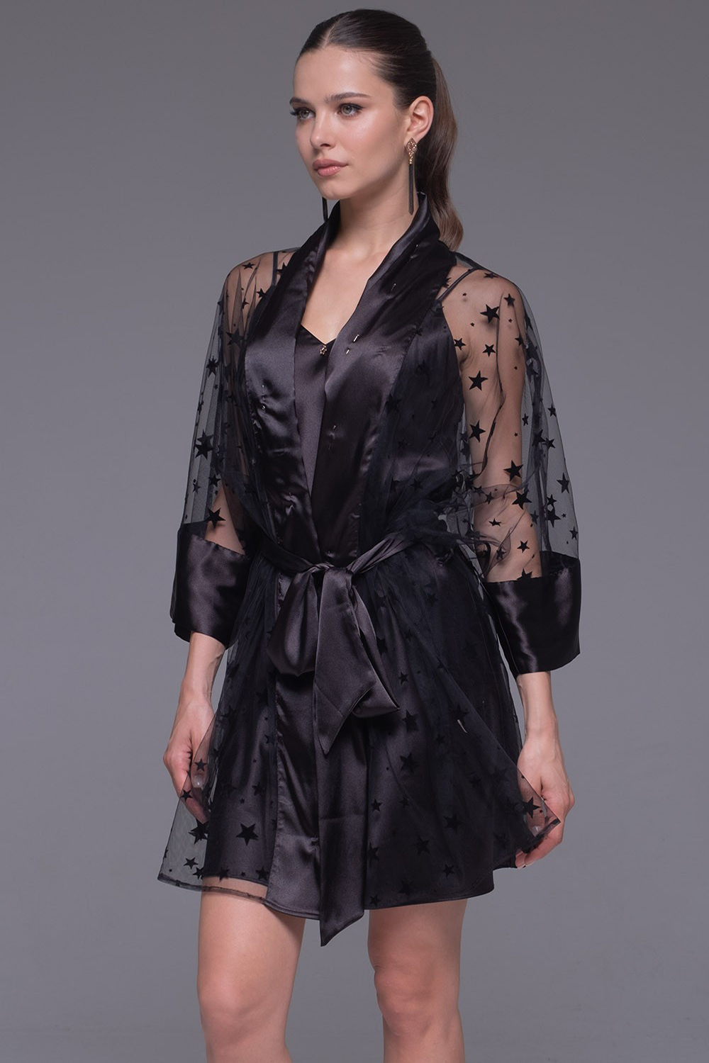 Короткий халат Mia-Amore выполнен из сетки в сочетании с атласными планкой и манжетами. Халат завязывается на широкий атласный пояс.