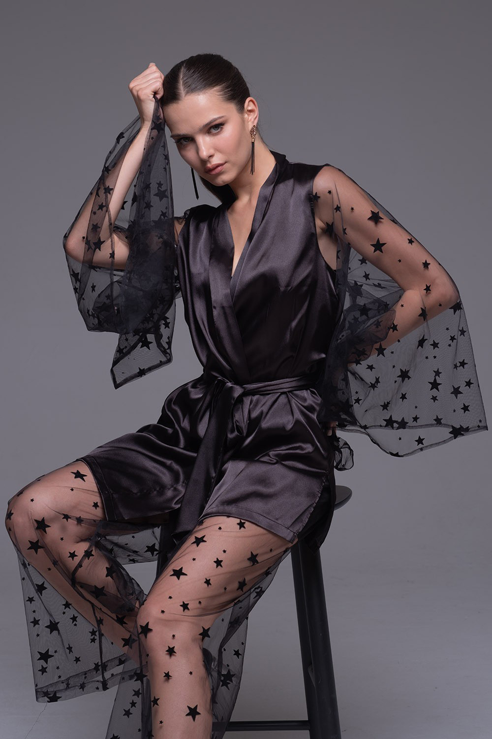 Комплект Mia-Amore состоит из четырёх предметов: топа, брюк, шорт и запашного жакета. Укороченный топ спереди из смесового шёлка, эффектная спинка из сетки на завязке. Пышные шорты выполнен полностью из смесового шёлка. Брюки полностью отшиты из сетки, но внутри есть короткая подкладка из атласа. Запашной жакет выполнен из смесового шёлка, эффектные широкие рукава из мягкой сетки со звёздочками.