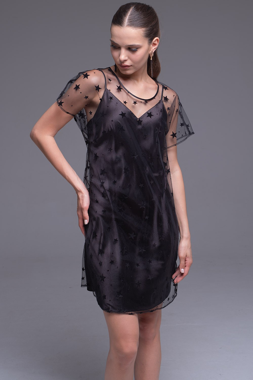 Короткая туника Mia-Amore длиной до колен со спущенным коротким рукавом выполнена полностью из сетки в сочетании с атласными планкой и манжетами. Прозрачную тунику можно сочетать с атласной сорочкой.
