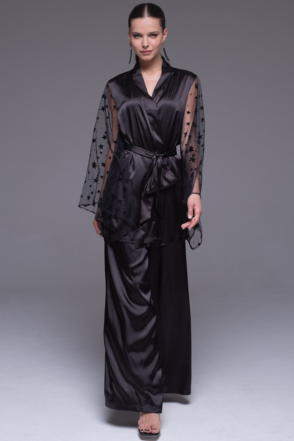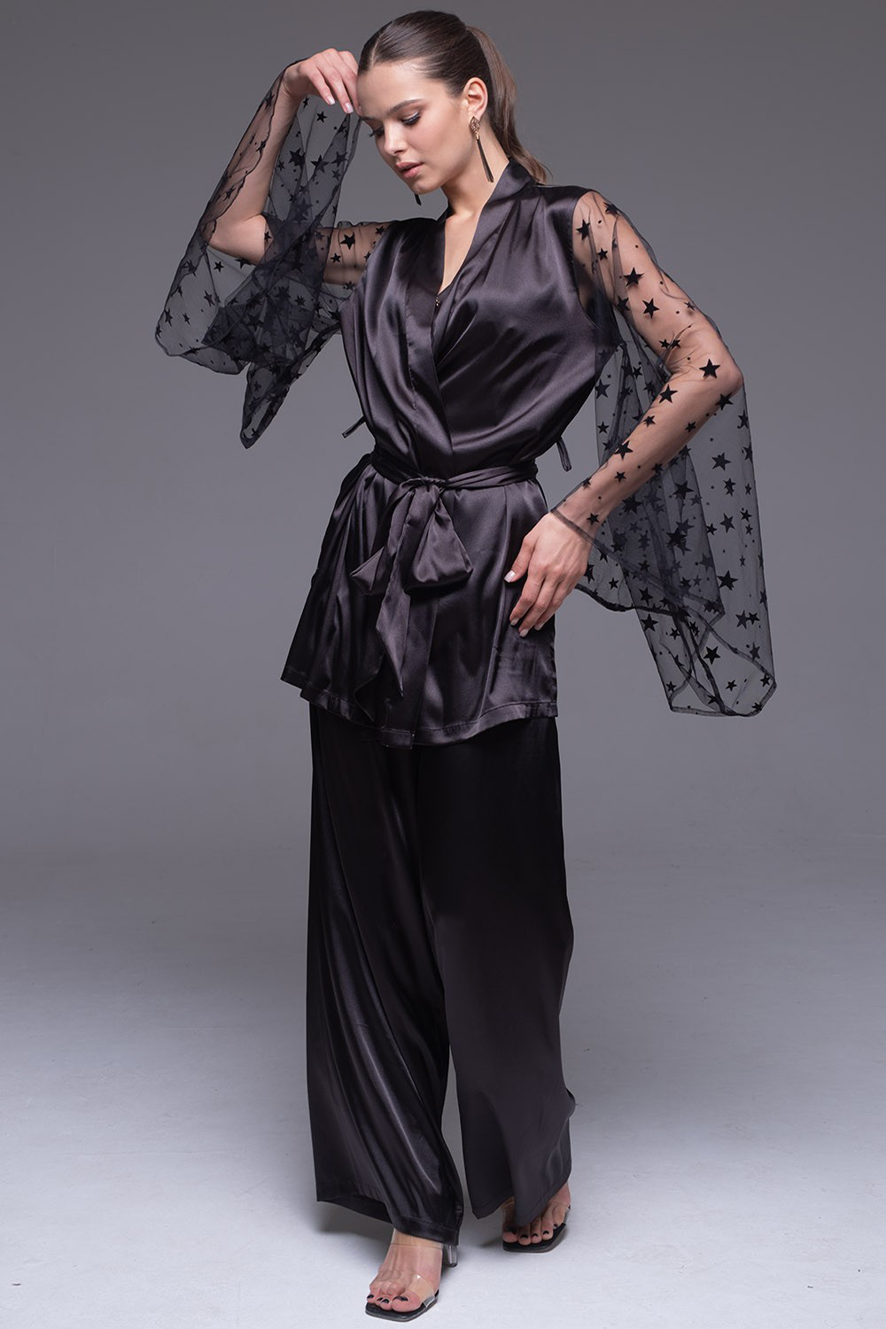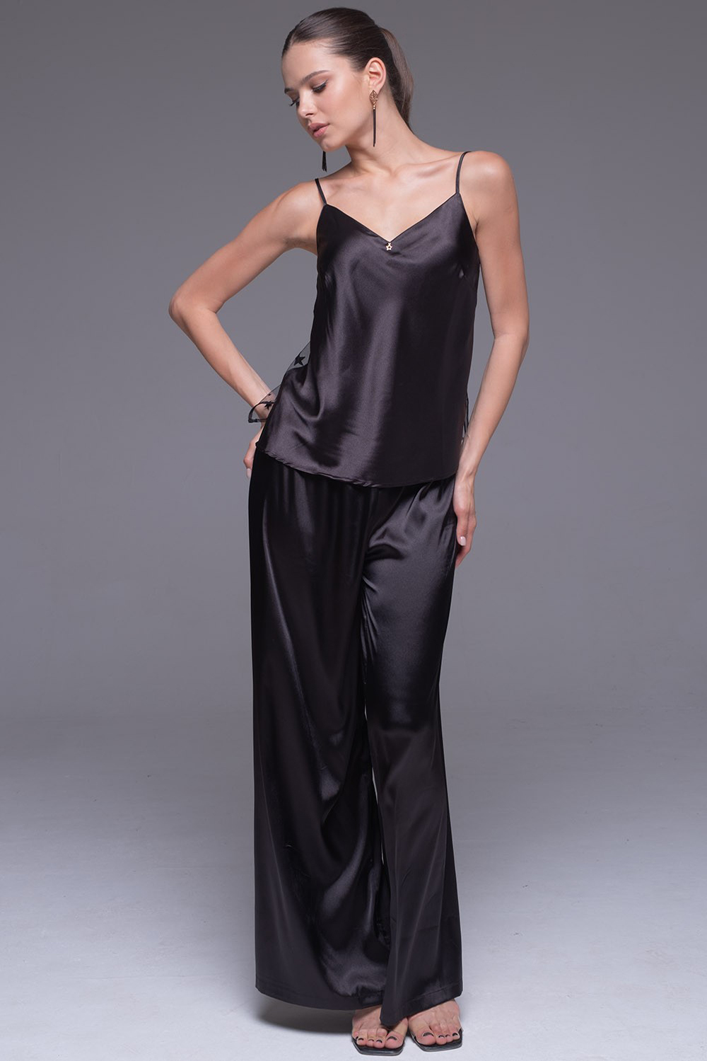 Комплект-тройка Mia-Amore выполнен из смесового шёлка в сочетании с сеткой. Топ с атласной передней частью, по спинке вставка из сетки. Брюки-палаццо полностью отшиты из смесового шёлка.