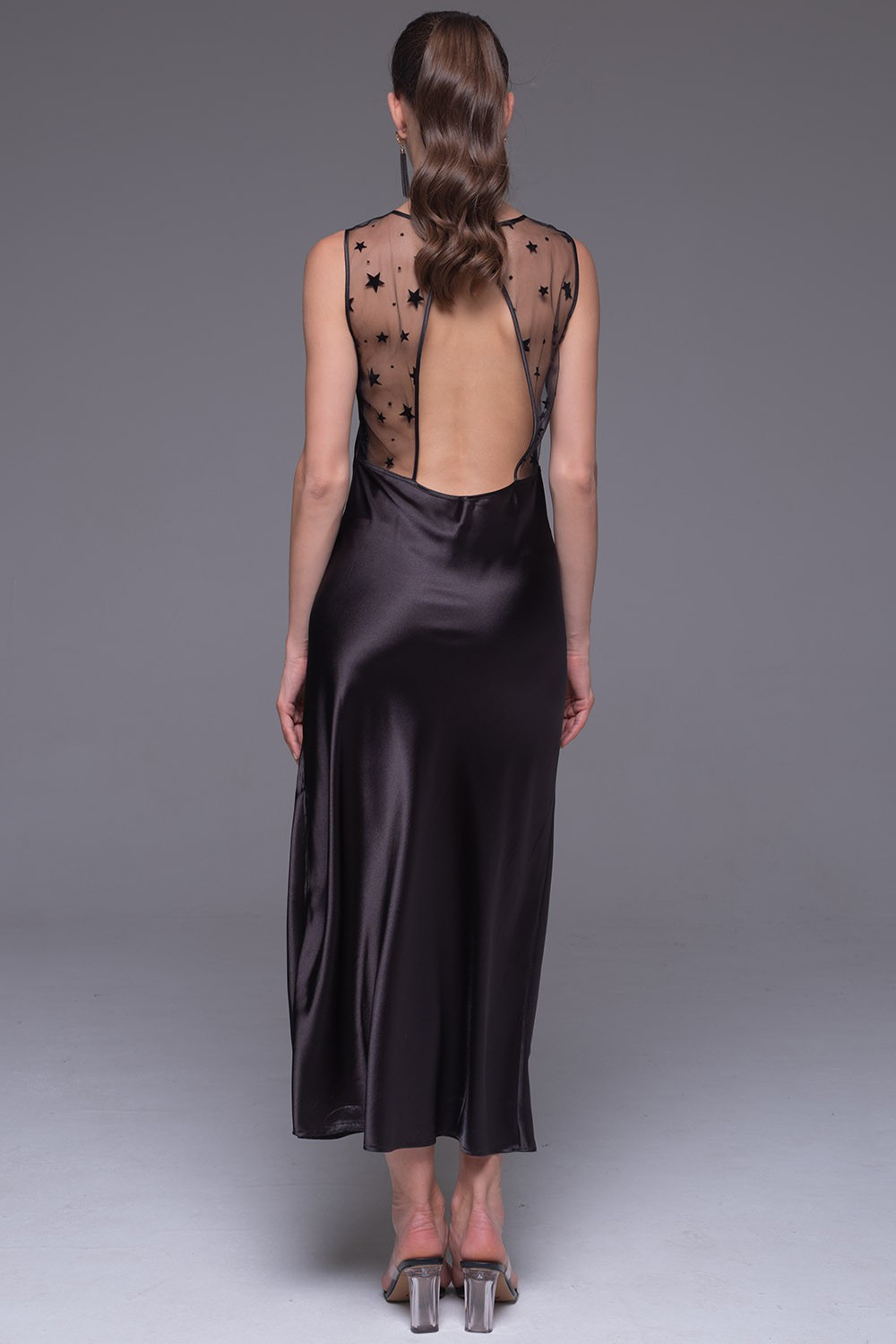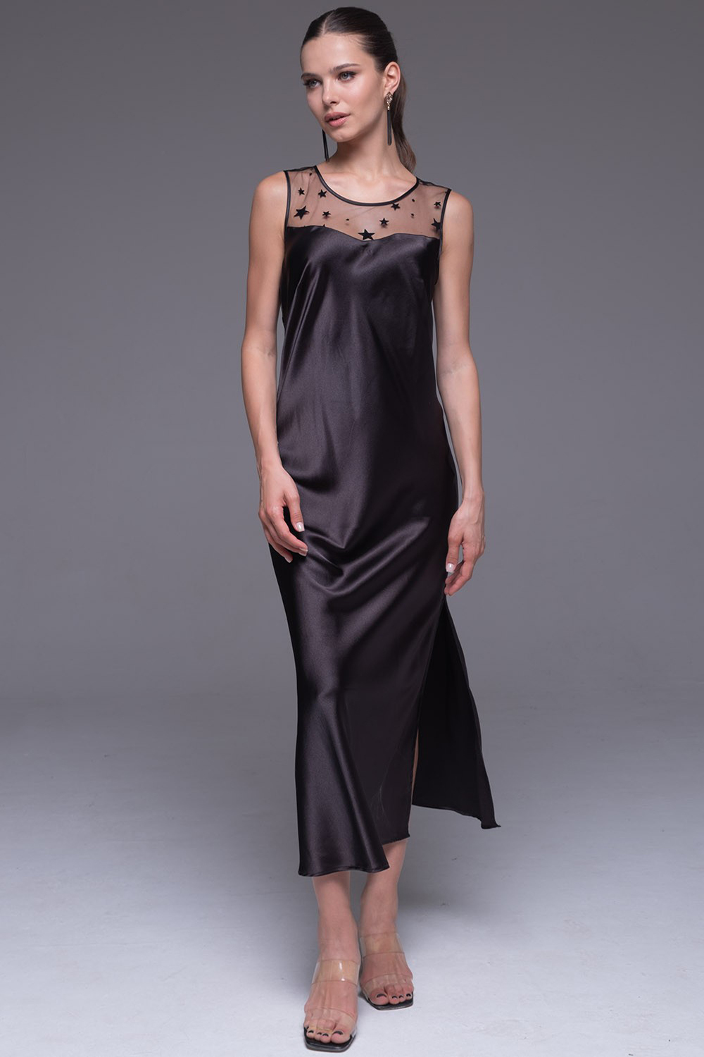 Длинная сорочка Mia-Amore выполнена из смесового шёлка в сочетании с сеткой. Спереди на лифе вставка из сетки, соблазнительный вырез на спинке также оформлен сеткой со звёздочками.