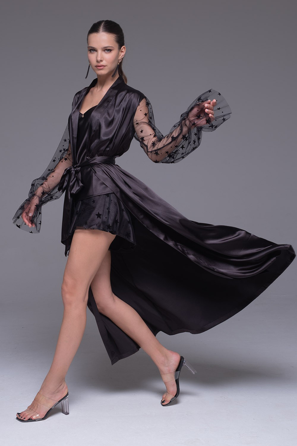 Длинный халат Mia-Amore выполнен из смесового шёлка. Декоративной частью халата являются эффектные широкие рукава из сетки с резинкой по низу и широкой оборкой. Халат запахивается широким атласным поясом.