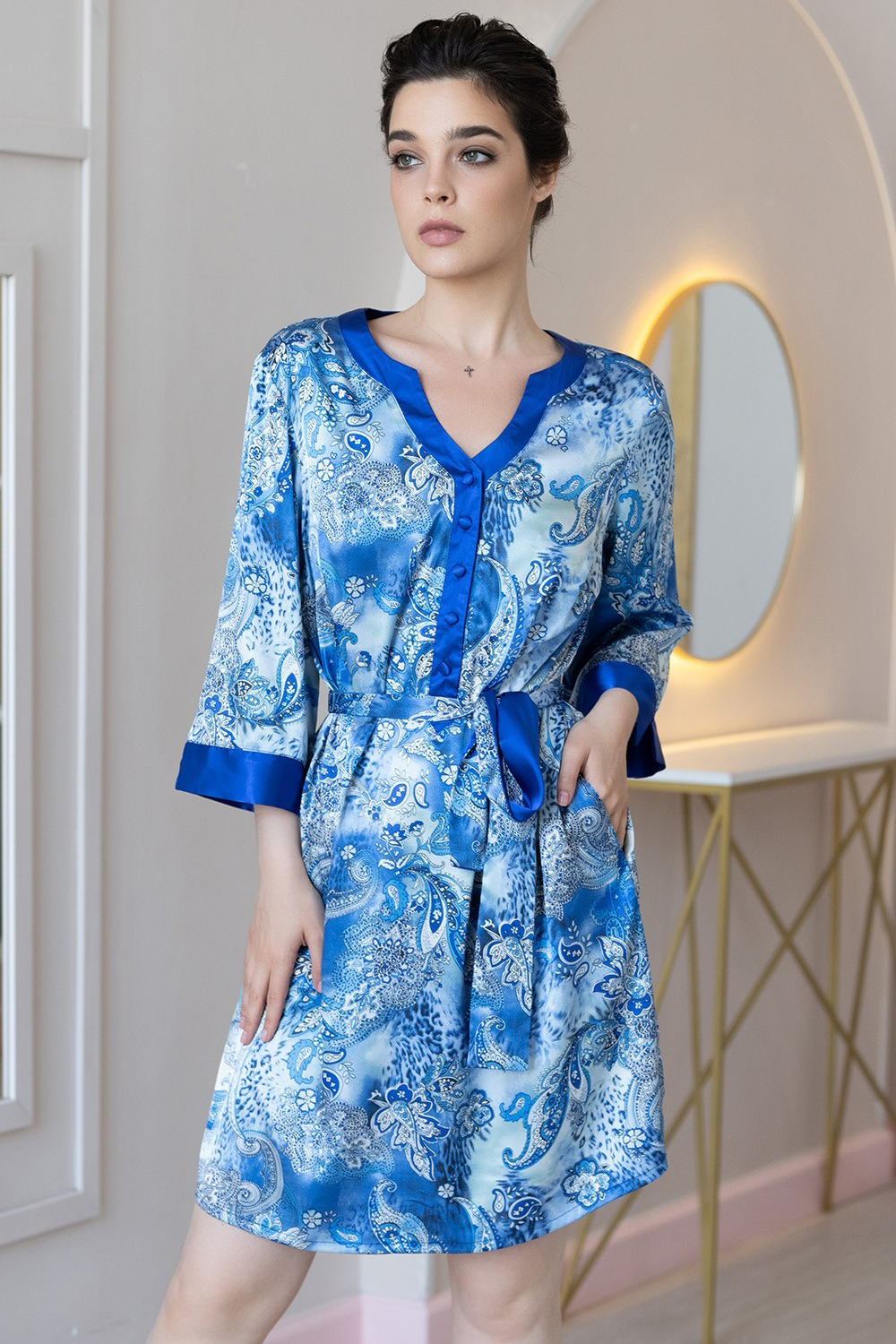 Туника Mia-Amore свободного покроя с рукавом длиной ?, выполнена из принтованной смесовой ткани. Планка и низ рукавов декорированы однотонным атласом. В боковых швах расположены карманы, а понизу разрезы.