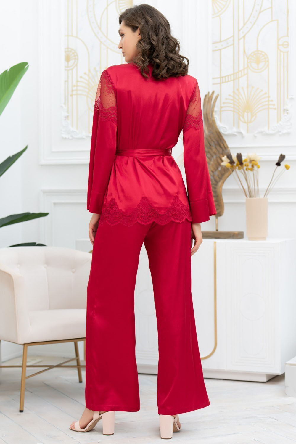 Элегантный комплект Mia-Amore - состоит из жакета с длинным рукавом, широких брюк и кружевного бралетта, выполнен из смесового шелка и дополнен кружевными вставками. Линию талии можно подчеркнуть за счет широкого пояса с кружевными вставками на концах, который идет в комплекте.