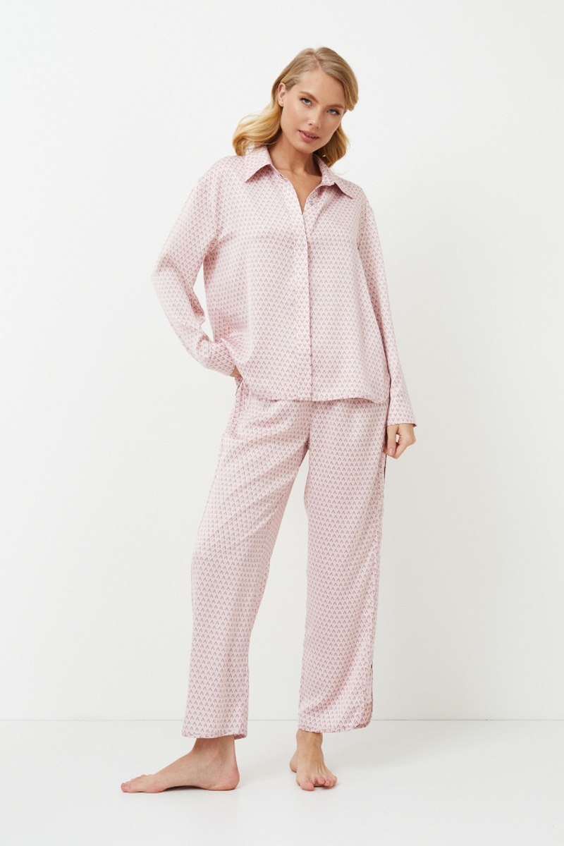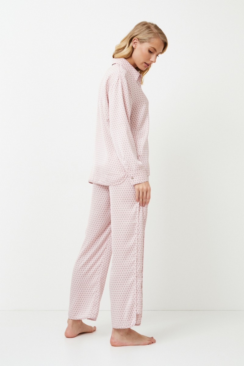 Представляем длинную пижаму Aurelia, в которой комфорт сочетается со стилем в каждой детали. Этот комплект выполнен в очаровательном розовом цвете и украшен мелкими коричневыми орнаментами, придающими ему нотку гламура и стиля. Топ с длинными рукавами, застегивающийся на пуговицы, и классическим воротником придают ему элегантность, неподвластную времени. Он сочетается с брюками классического кроя с закругленными углами и украшен уникальной отделкой по бокам. Почувствуйте комфорт и расслабление, каких никогда раньше не было, с длинной пижамой Aurelia, созданной для ночей, наполненных стилем и очарованием.