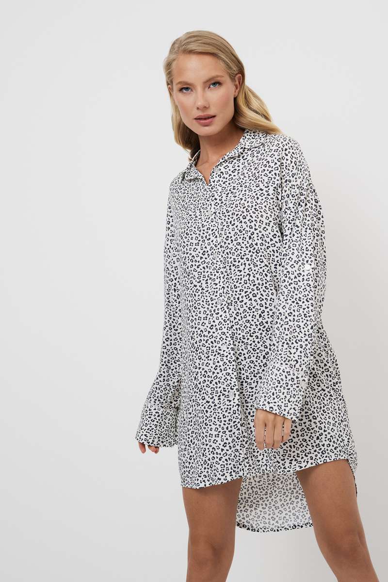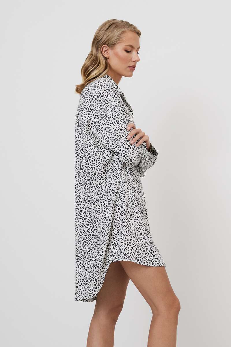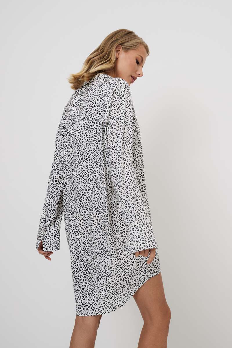 Представляем вам ночную сорочку Bella, в которой смелость сочетается с элегантностью и ноткой дикости. Она изготовлена из лёгкой вискозной ткани с шикарным серым леопардовым принтом. Она отличается округлым низом, более длинной спинкой с кокеткой для создания привлекательного силуэта. Украшена подходящей по цвету окантовкой на манжетах рукавов. Позвольте своей внутренней дикой кошке свободно резвиться в ночной рубашке Bella, в которой каждый изгиб подчёркивается дерзким очарованием.
