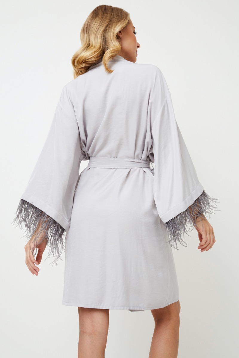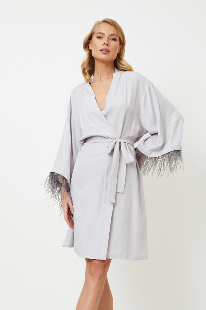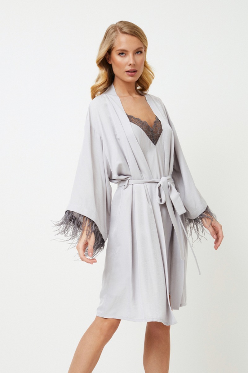 Шикарно и великолепно...не требуется больше слов… Платье Brigitte выполнено из очень мягкой ткани нежно-серого цвета с эффектом шелка. Платье украшено съемными перьями более темного цвета на манжетах и завязывается поясом. Для удобства движений платье дополнительно завязано внутренними завязками. Его легко сочетать с нашей ночной рубашкой Brigitte!
