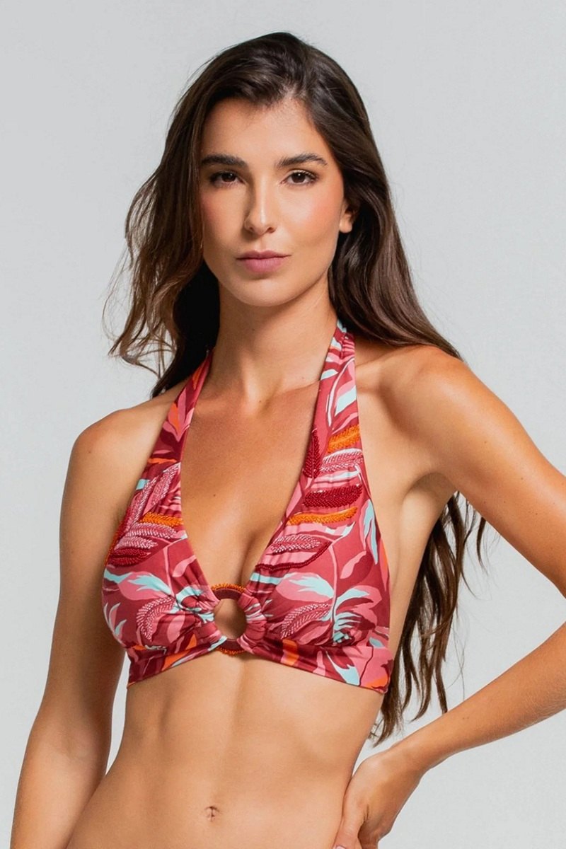 Бюст купальный от колумбийского бренда Cosita Linda.Романтичный и изысканный топ с бретелью-хомутом украшен вышивкой ручной работы. Кольцо спереди придает изделию особый шарм и делает его эффектным купальником.