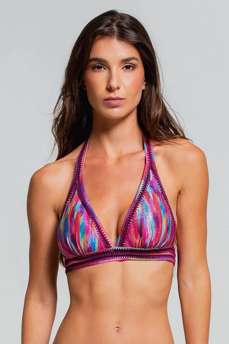 Купальный бюст от колумбийского бренда Cosita Linda выполнен с бретелью-хомутом и украшен ручной строчкой по краям. Блестящая ткань с металлическим отливом приобретает фактурность благодаря этой детали. Съемные чашечки из тонкого поролона и поддерживающий крой создают гармоничный баланс между элегантностью и мастерством исполнения.