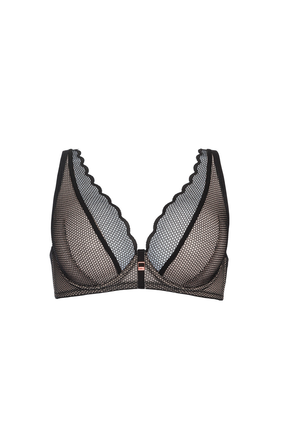 Бюстгальтер-бралетт с мягкой чашкой на косточках, с боковой поддержкой. Внутри чашечки проложены хлопковым трикотажем, внешняя сторона чашек покрыта сеточкой. Бретели несъёмные, регулируемые по длине. На спинке регулируемая застежка.