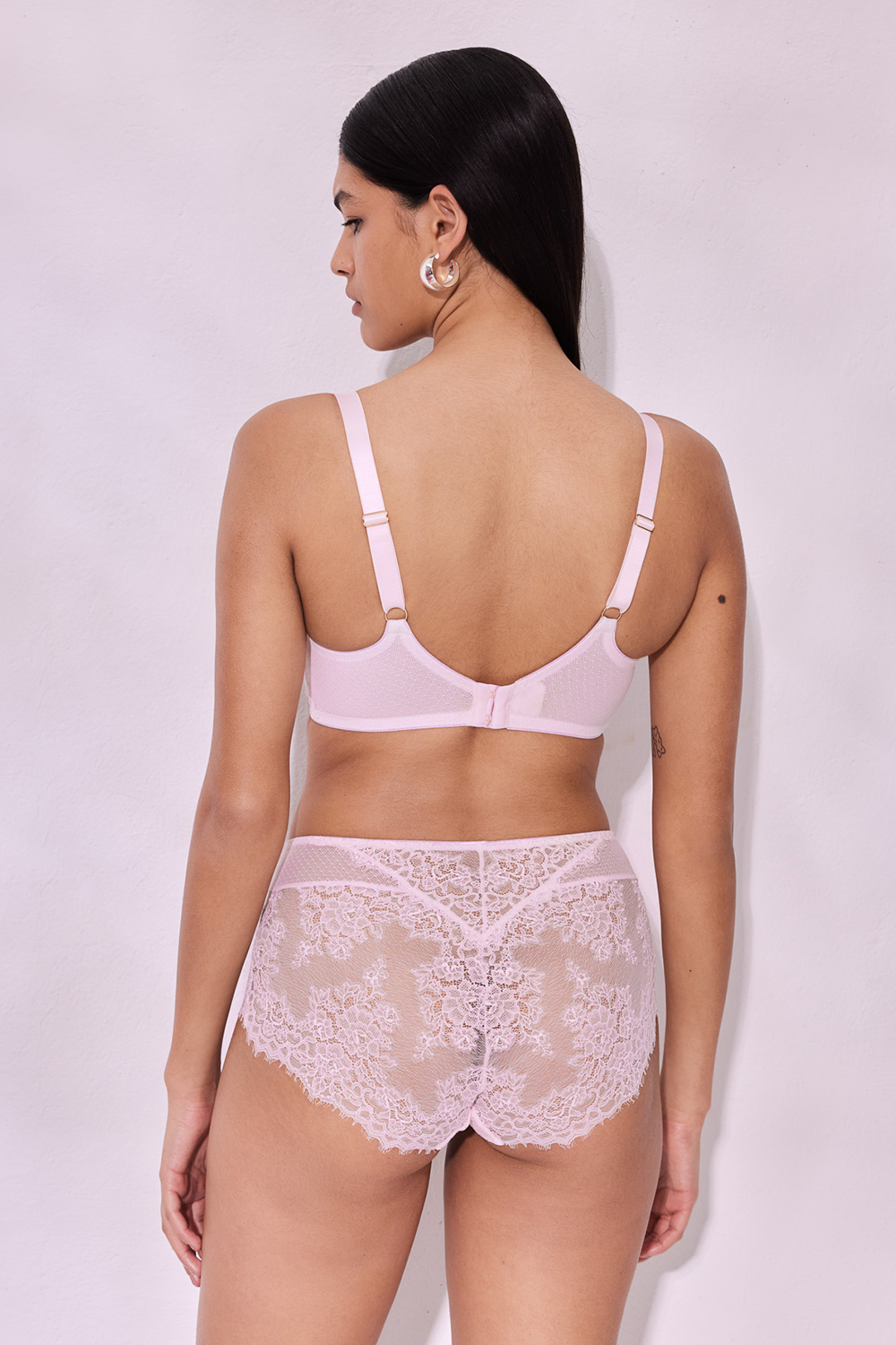 Бюстгальтер Hush Blush на косточках, с боковой поддержкой, нижняя часть чашки на уплотнителе, верхняя из нежного кружева. Внутри чашечки проложены хлопковым трикотажем. Бретельки не отстегиваются, регулируются по длине. Между чашек красивое украшение в виде подвески. На спинке застежка регулируется.