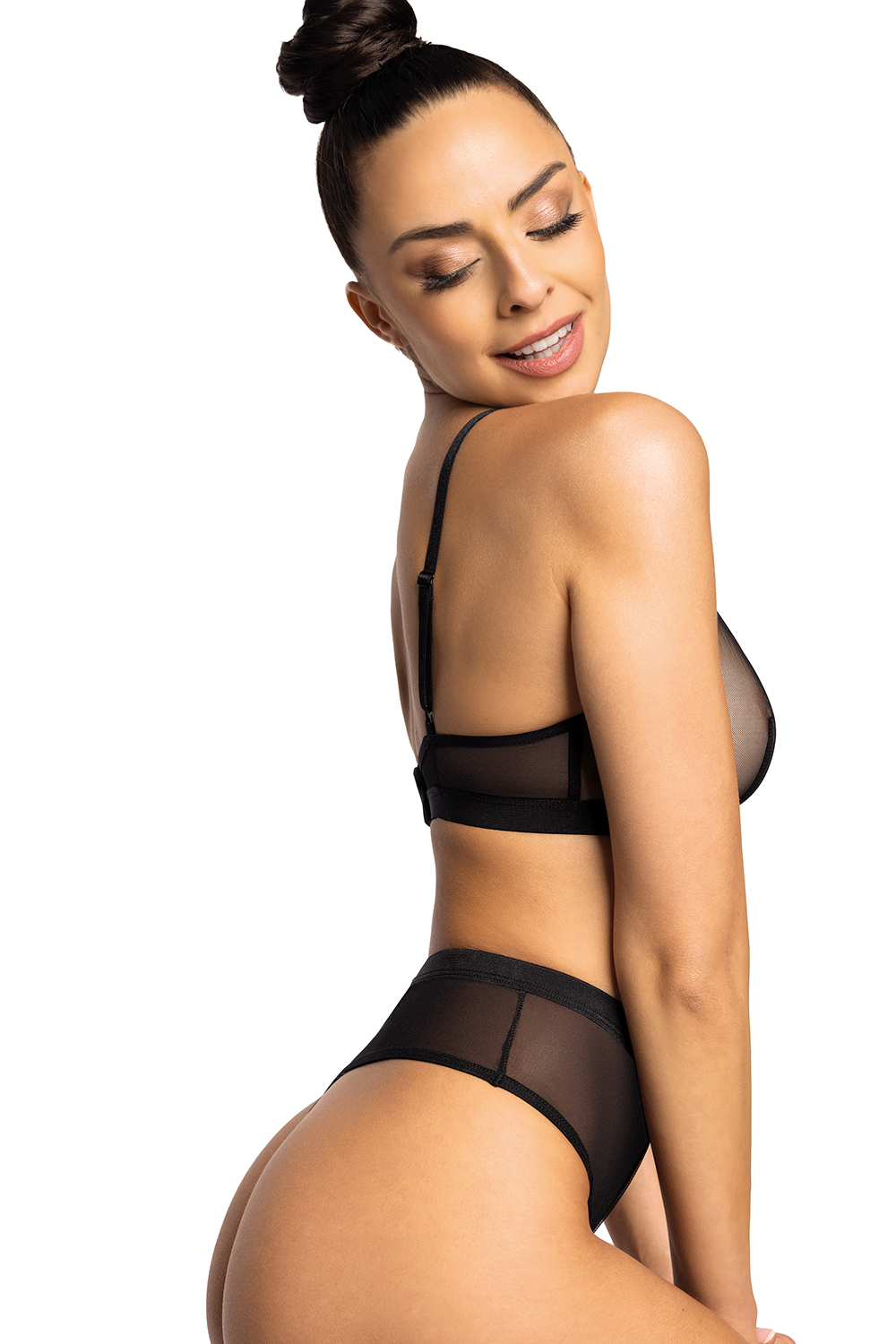Бюстгальтер Aggie с мягкими чашками. Чашки изготовлены из нежного полупрозрачного материала черного цвета. Бретели регулируются по длине. Спинка из тонкого эластичного материала. На спине застежка на крючки-петли.