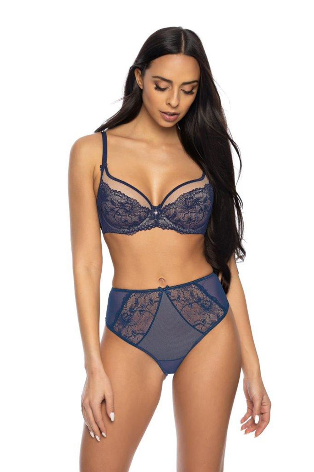 Элегантный и чувственный мягкий бюстгальтер Percy бежево-синего цвета. Верхняя часть чашки изготовлена из эластичной сетки с окантовкой. Нижняя часть чашки и перемычка покрыты красивым кружевом. Бант с ювелирной подвеской между чашками. Спинка - двойная сетка. Бока усилены вертикальной косточкой. Бретели регулируемые, несъемные.