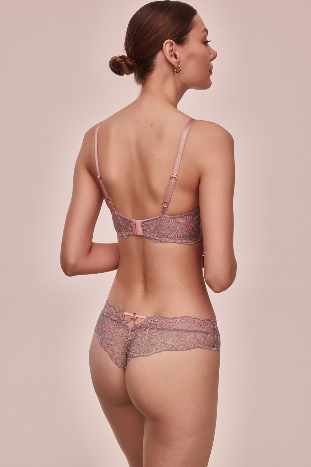 Бескаркасный бюстгальтер Madera с формованными чашками супер пуш-ап выполнен из роскошного сиреневого кружева с цветочным узором. Бретельки регулируются по длине, на спине застежка на крючки-петли. Между чашек красивое украшение в виде подвески и атласной ленточки. Комфортный бюстгальтер подойдет под любую одежду. Чашечки поддерживают и максимально увеличивают бюст, создают пышное декольте.