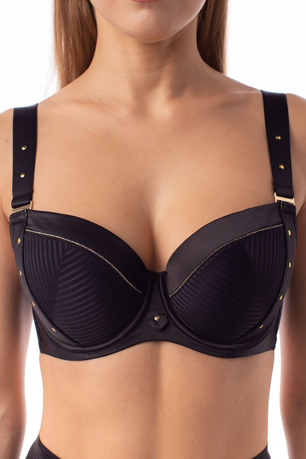 Бюстгальтер с градуированными чашками на поролоне и на каркасах. Идеально приподнимает и поддерживает грудь, создавая красивую зону декольте. На стане бюстгальтера вертикальные упругие, корректирующие пластины, позволяющие прилегать к телу и не скручиваться боковой части бюстгальтера. Бретели несъемные. Украшение: декоративный элемент на стане в виде галстука.