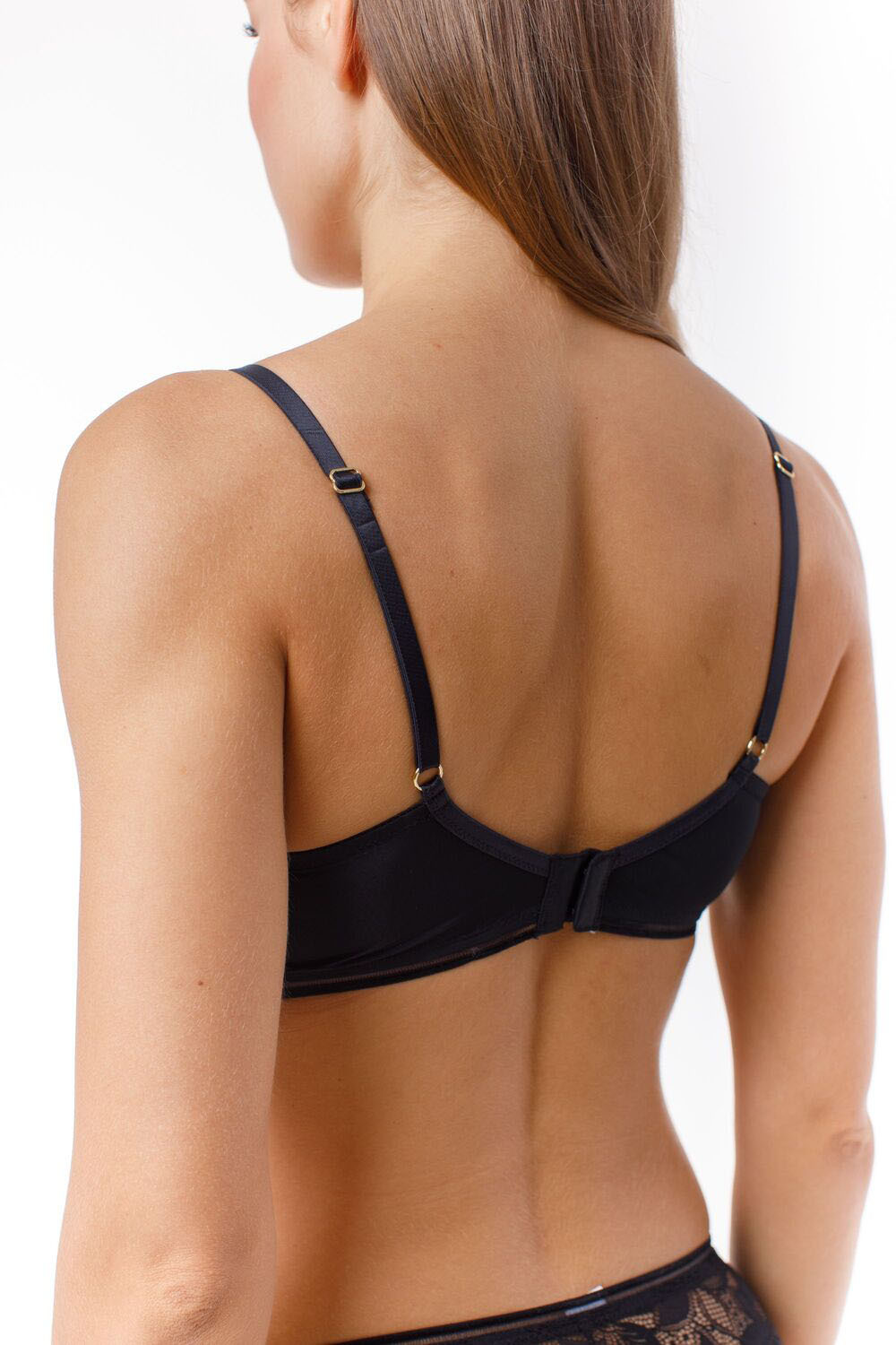 Бюстгальтер на поролоне на каркасах. Идеально приподнимает и поддерживает грудь, создавая красивую зону декольте. Выполнен из эластичного кружева и эластичного полотна. Внутри чашка продублированна хлопком. На стане бюстгальтера вертикальные упругие, корректирующие пластины, позволяющие прилегать к телу и не скручиваться боковой части бюстгальтера. Украшение: медальон с логотипом COQUETTE REVUE.