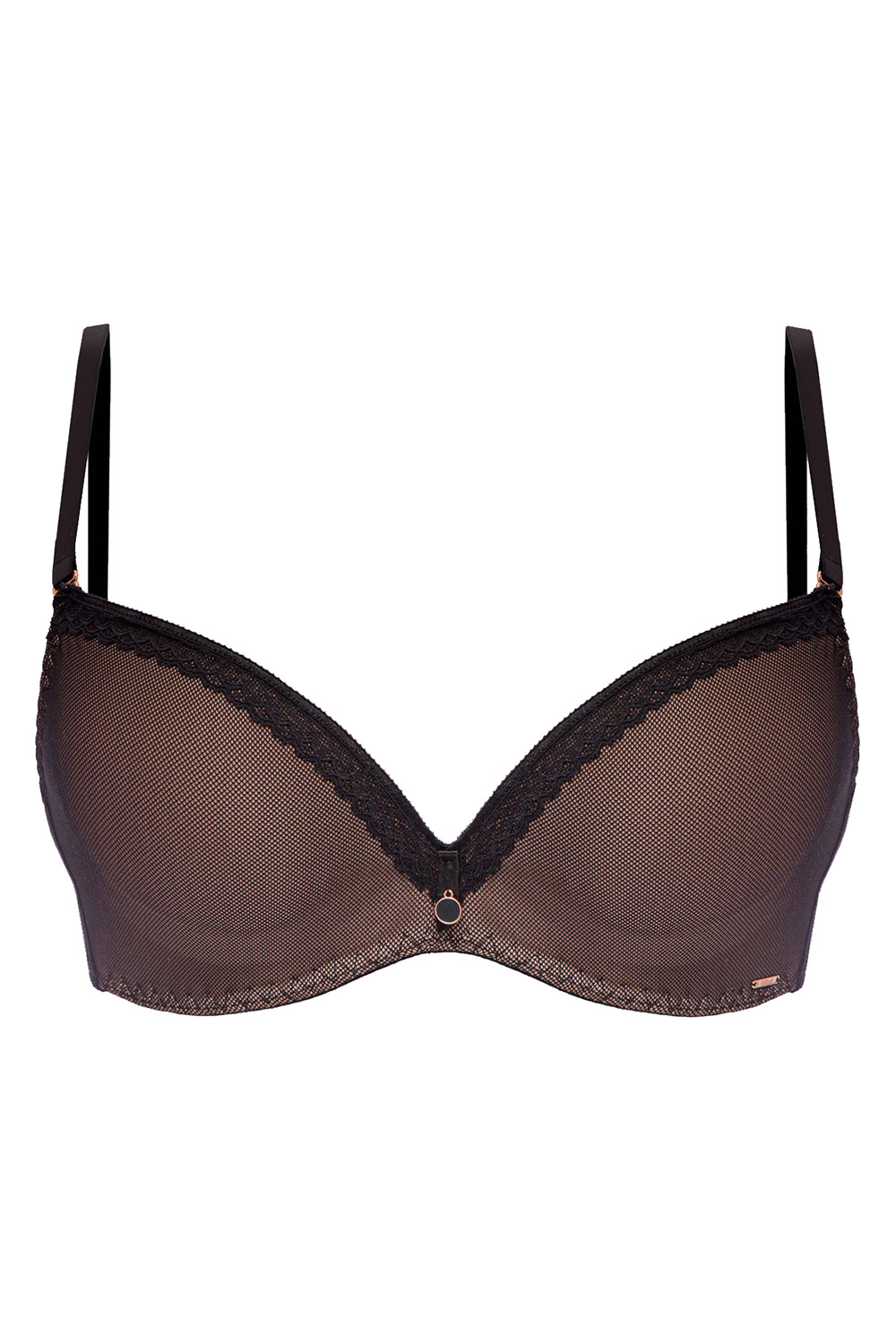 Бескаркасный бюстгальтер Nocturn с формованными чашками супер пуш-ап выполнен из полупрозрачной сетки. Бретельки регулируются по длине, на спине застежка на крючки-петли. Между чашек красивое украшение в виде медальона. Комфортный бюстгальтер подойдет под любую одежду. Чашечки поддерживают и максимально увеличивают бюст, создают пышное декольте.